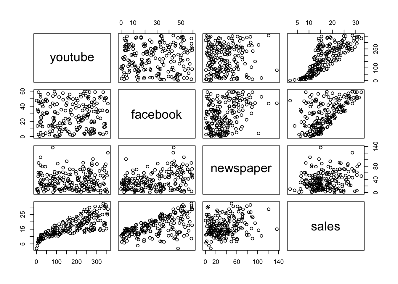 はメディア(youtube/facebook/newspaper)への広告出稿料と売上げ額(sales)のデータです。