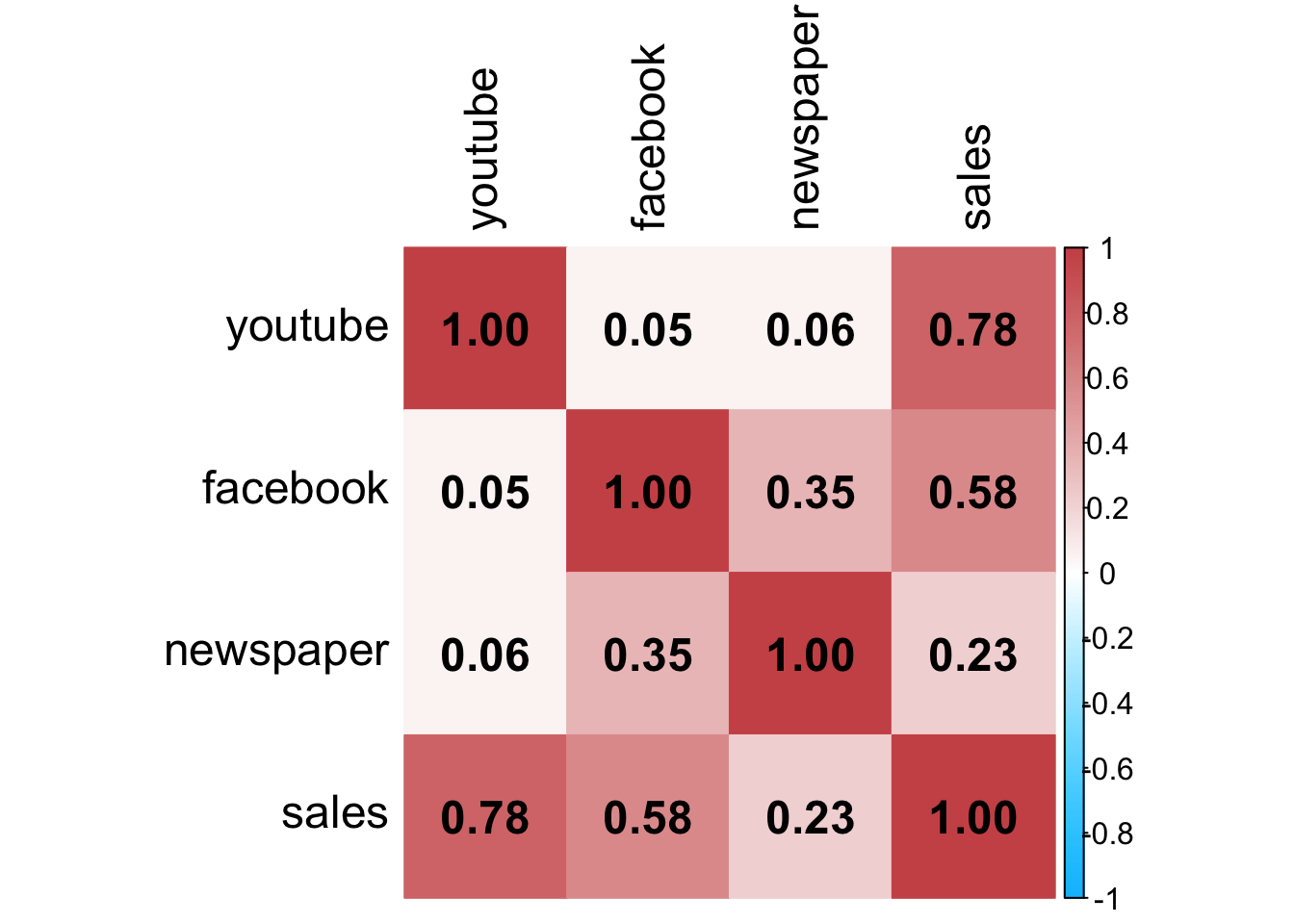 cor( x = subset( mkt, select = sales ), y = subset( mkt, select = -sales ) )