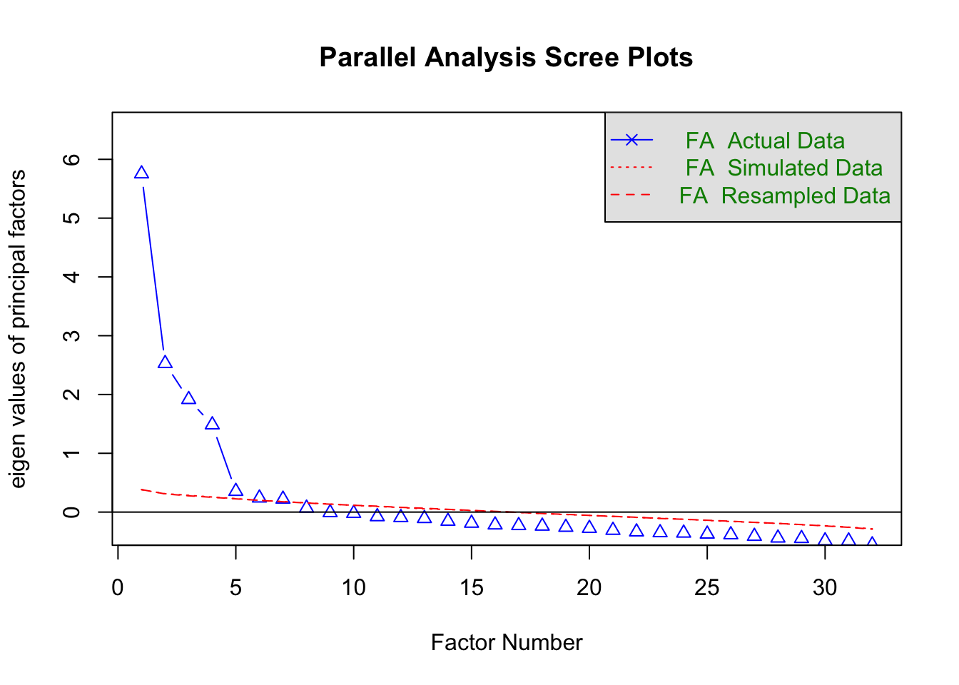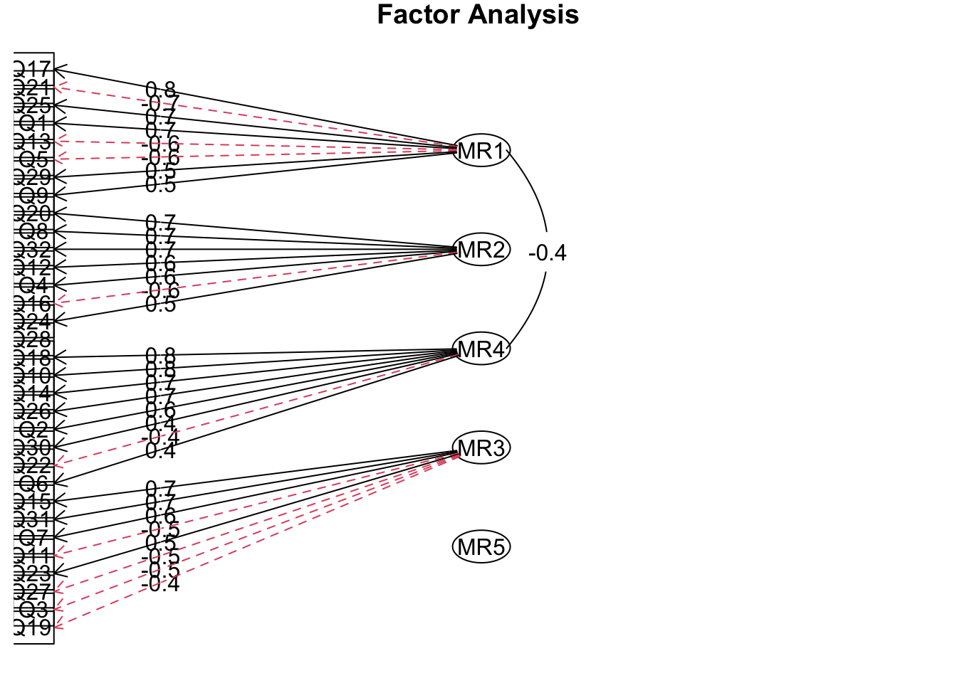 result = fa( dat, nfactors = 5, fm = "minres", rotate = "oblimin", use = "complete.obs" )