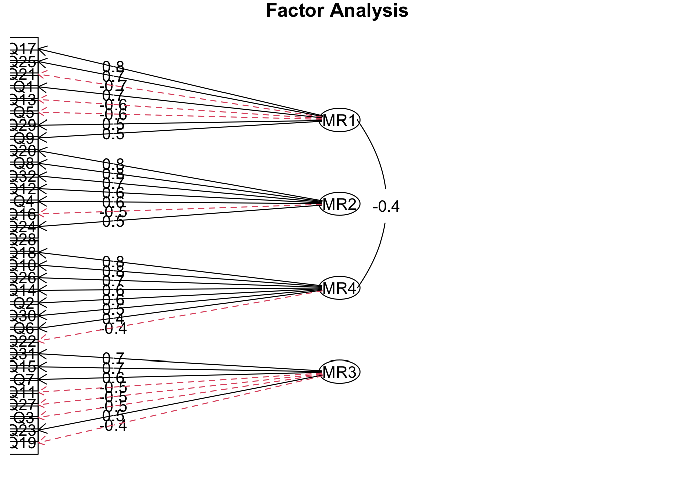 result = fa( dat, nfactors = 4, fm = "minres", rotate = "oblimin", use = "complete.obs" )