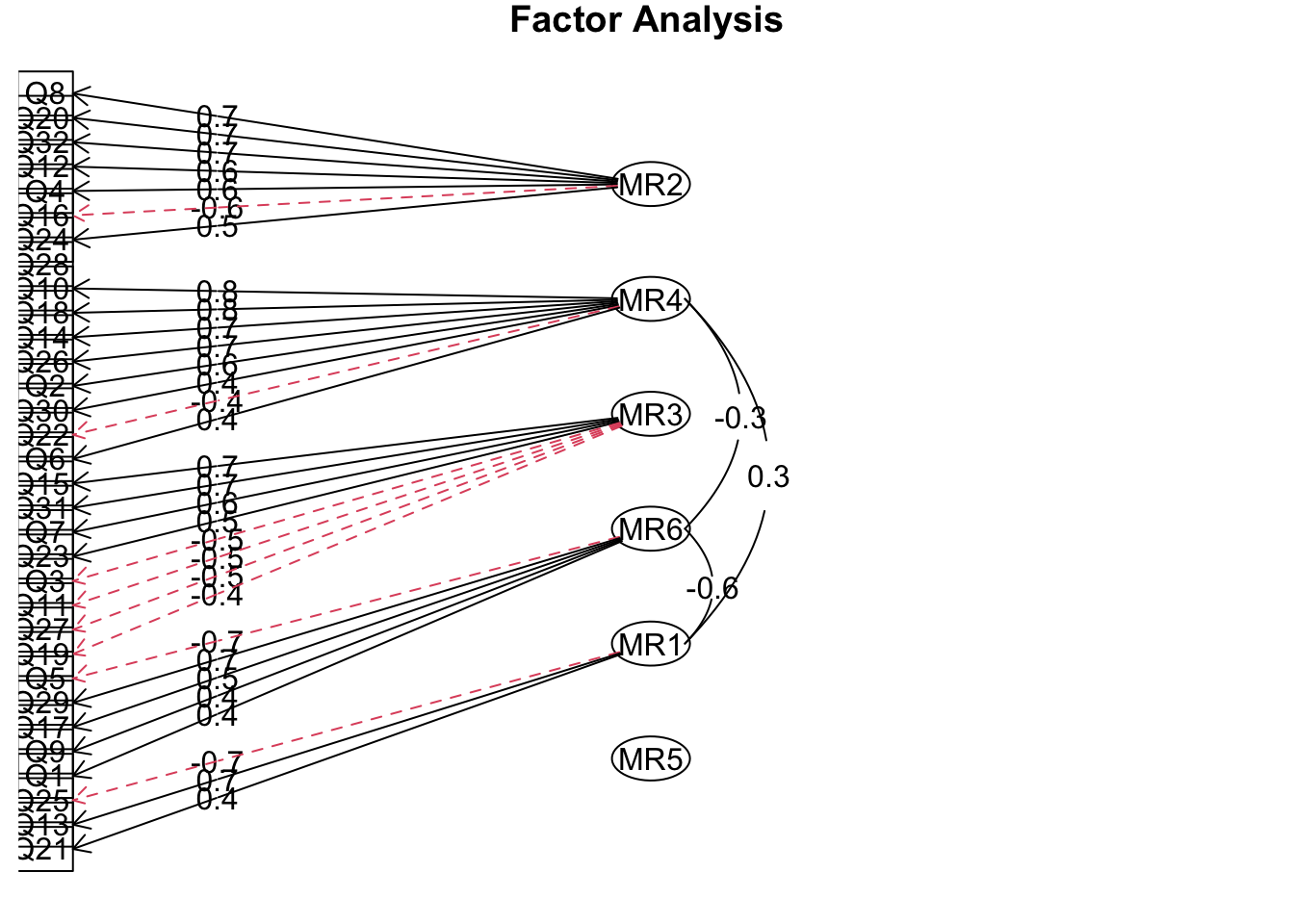 result = fa( dat, nfactors = 6, fm = "minres", rotate = "oblimin", use = "complete.obs" )