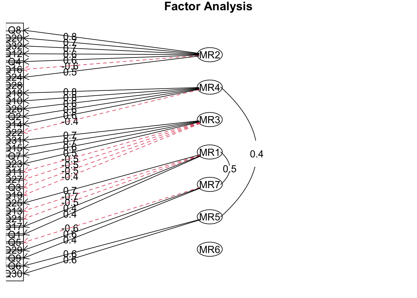 result = fa( dat, nfactors = 7, fm = "minres", rotate = "oblimin", use = "complete.obs" )