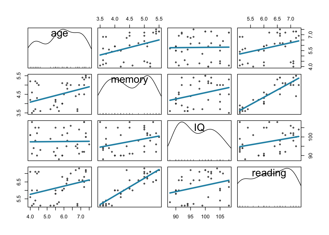 reading を目的変数とし、age・memory・IQ を説明変数とした重回帰分析をする。