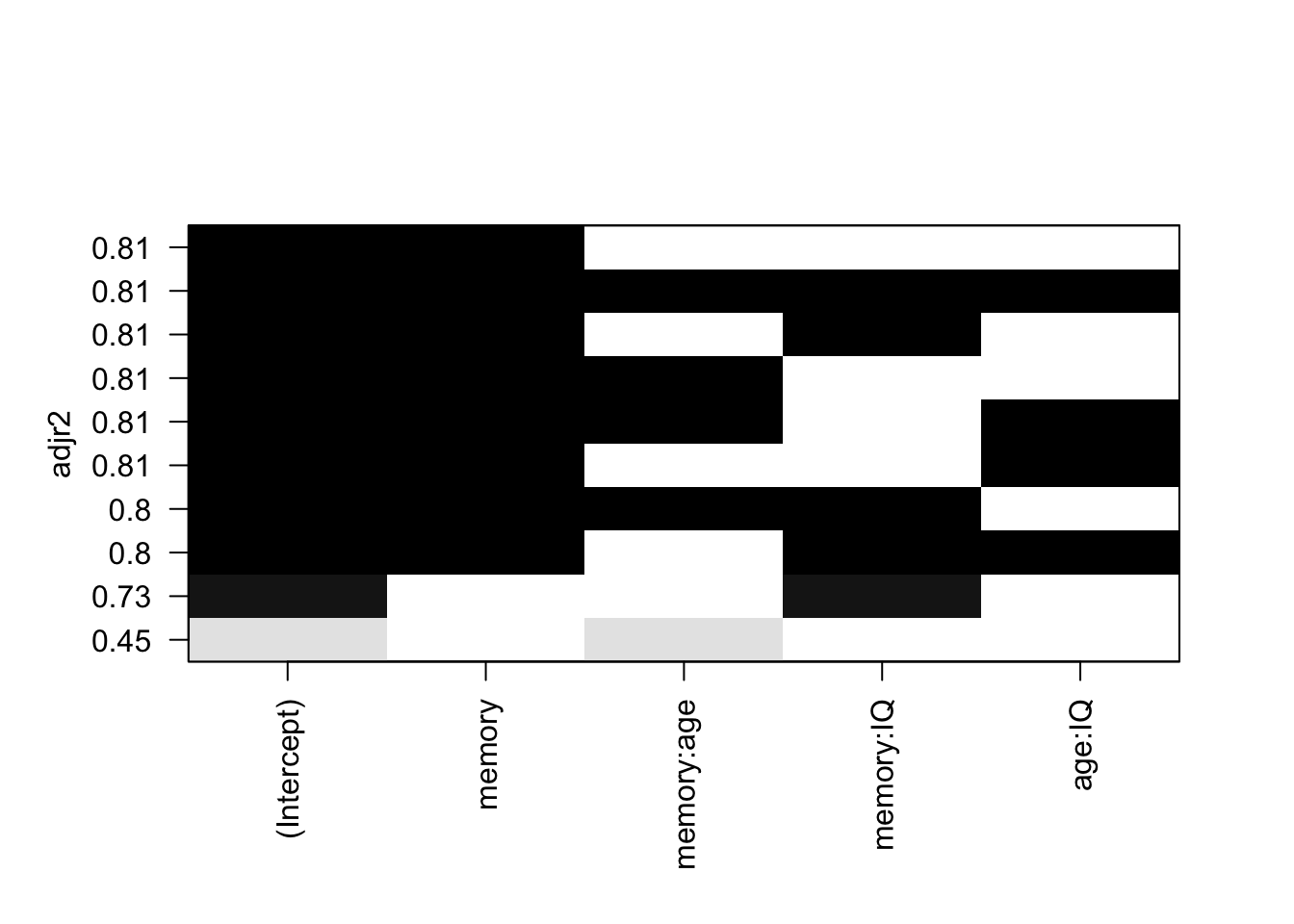 leaps = regsubsets( reading ~ memory + memory:age + memory:IQ + age:IQ,