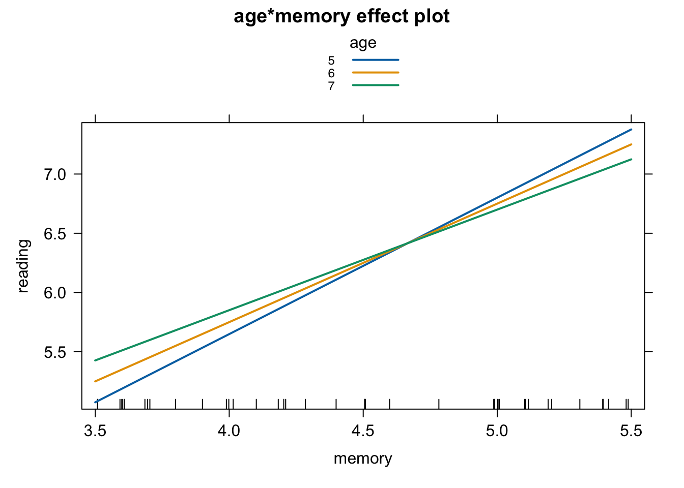 plot( effect( "age:memory", fit, xlevels = list( age = c(5,6,7) ) ), multiline = T )