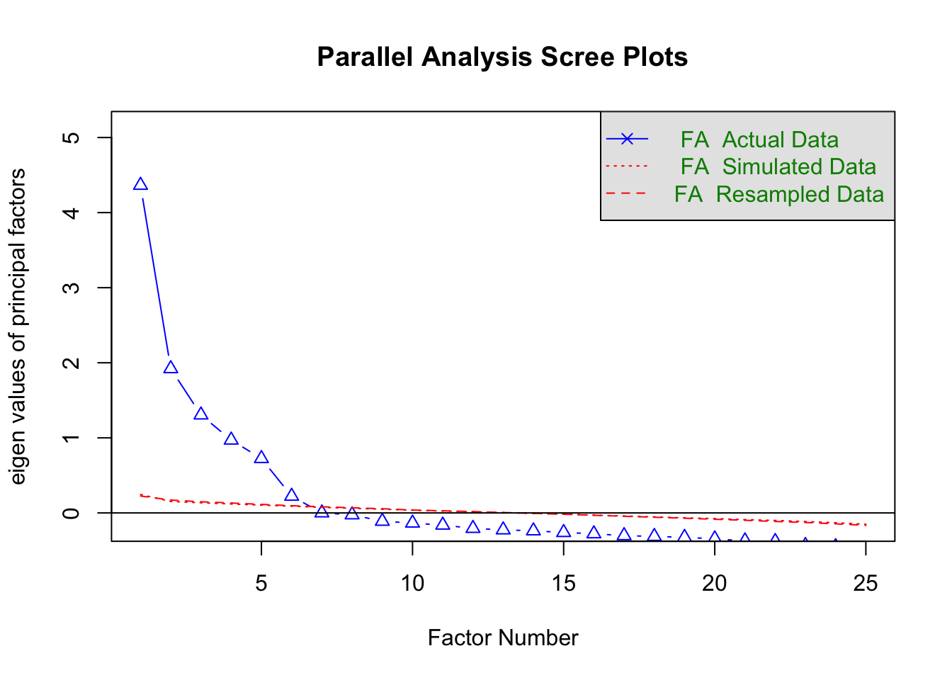 平行分析では、固有値が赤線を上回る因子を選びます。因子番号 6 までは図の青線は赤線より上にありますが、7 以降は青線の方が下になっているので、因子数は 6 と判断されます。fa.parallel()
