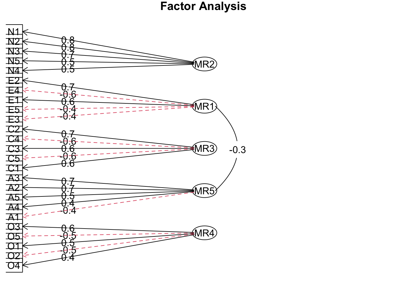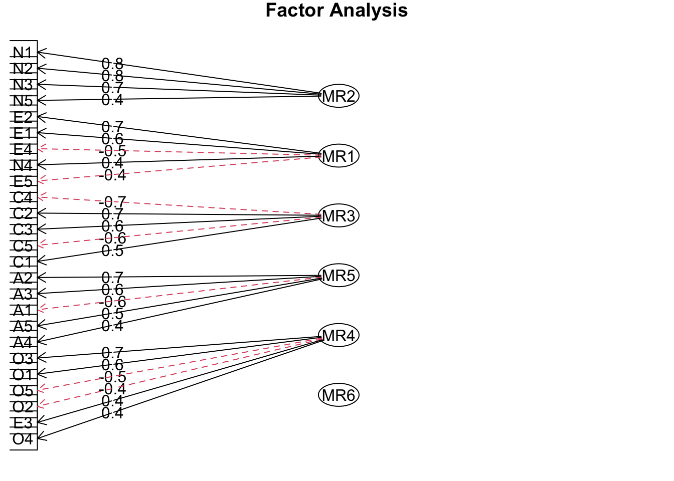 今回の結果の場合、第1因子は E1〜E5、第2因子は N、第3因子は C1〜C5、第4因子は O1〜O5、第5因子は A1〜A5 と強い関連を持つという結果になっています。