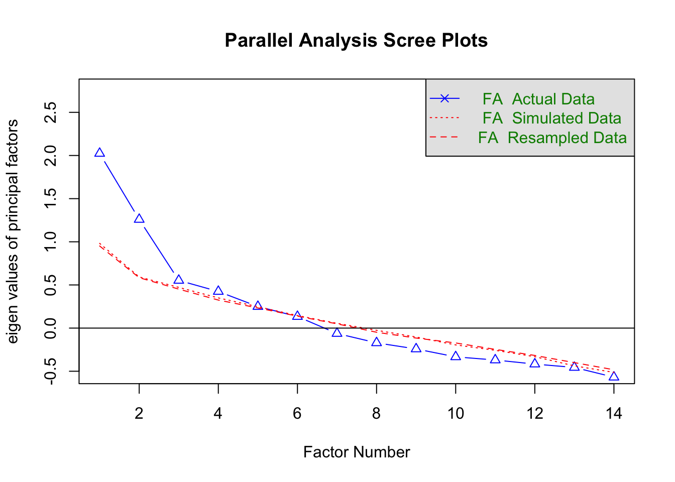 この図の青線は、各要因の固有値を折れ線グラフにしたものです。赤い点線(Simulated Data)は乱数データに因子分析をした結果、赤い破線(Resampled Data)は実データをランダムに並べ替えたデータに対して因子分析をした結果です(2種類の赤線はほぼ同じ結果であるため、重なって区別がつかなくなっています)。