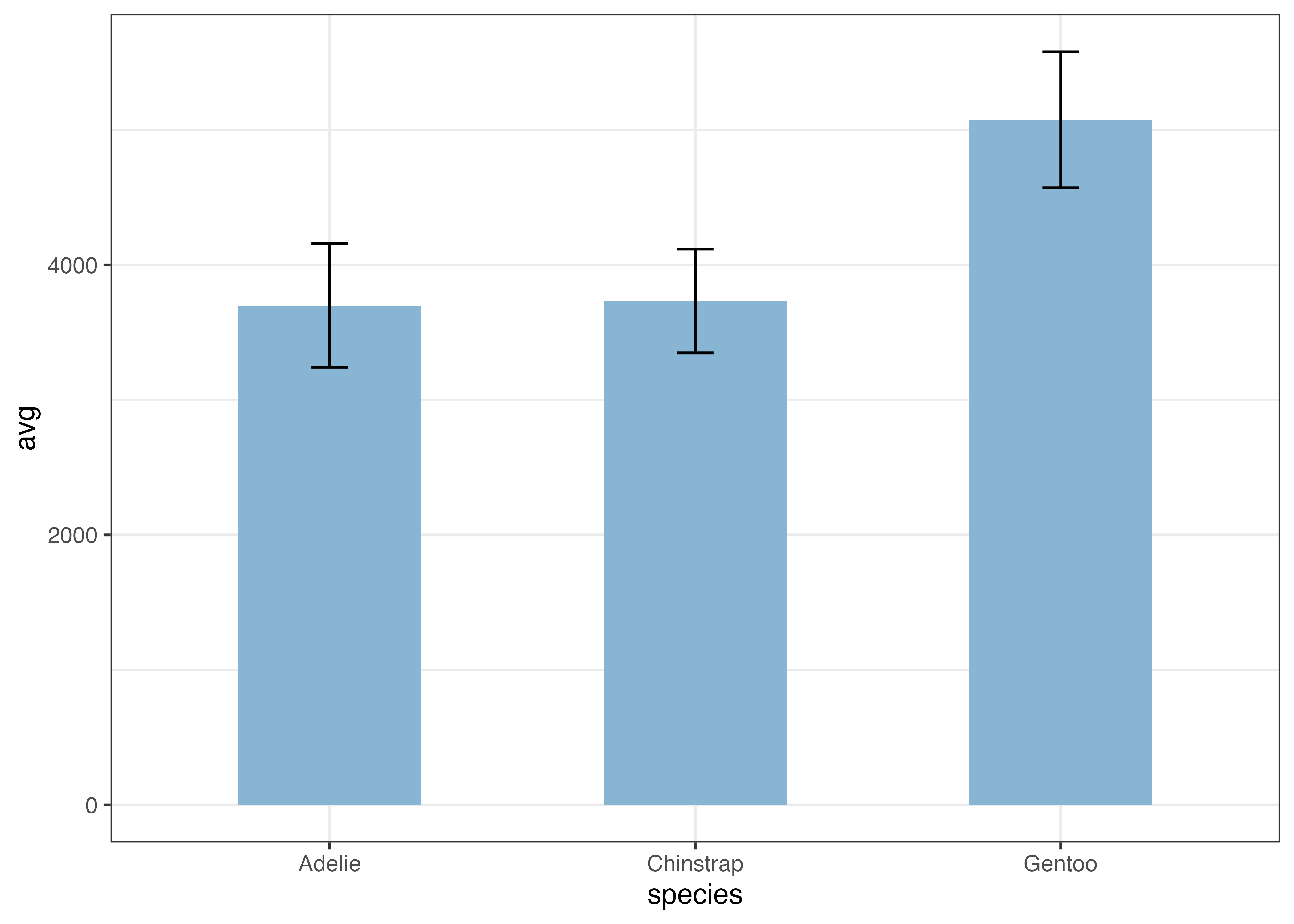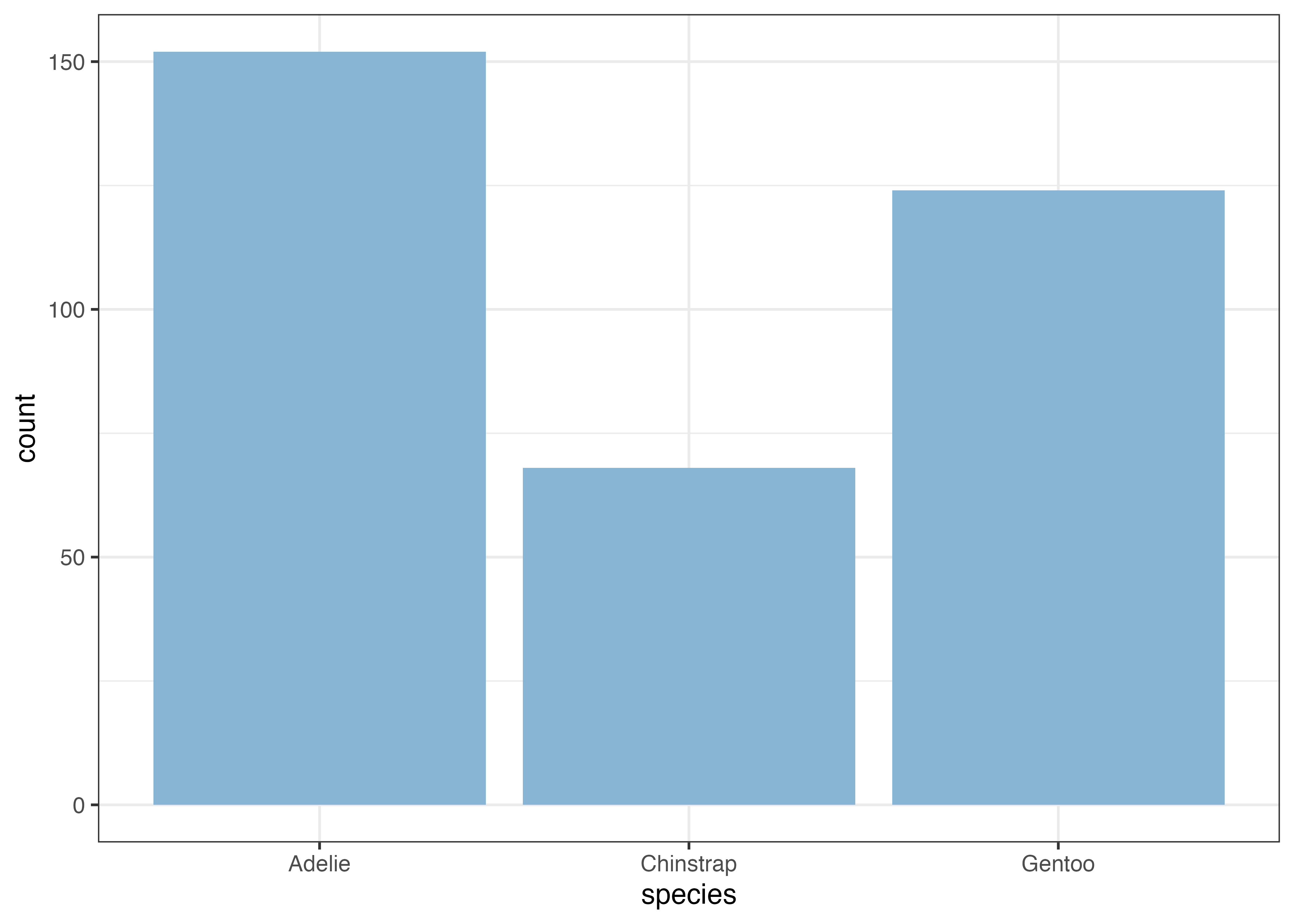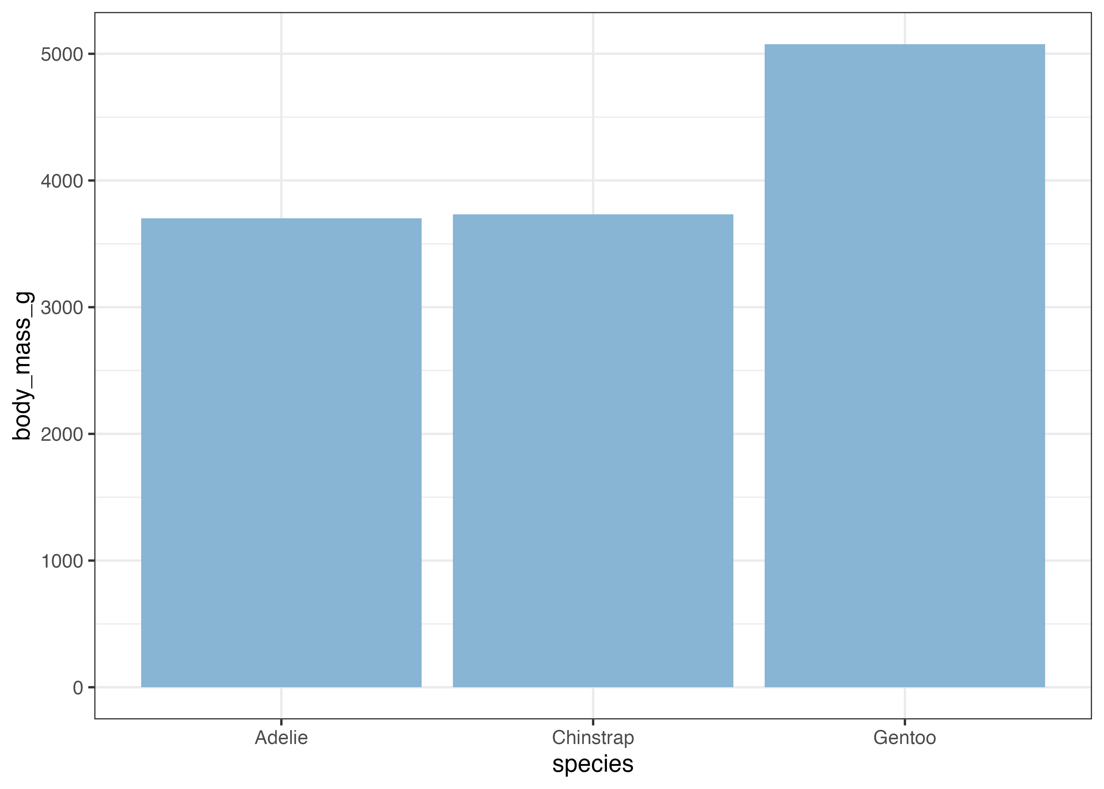 上述したgeom_bar()は、指定されたカテゴリごとのデータの件数(カウント数)を表示します。一方で、カウント数以外の値を縦軸として表示したい場合もあります。たとえば、ペンギンの種ごとの平均体重を表示する、などです。
