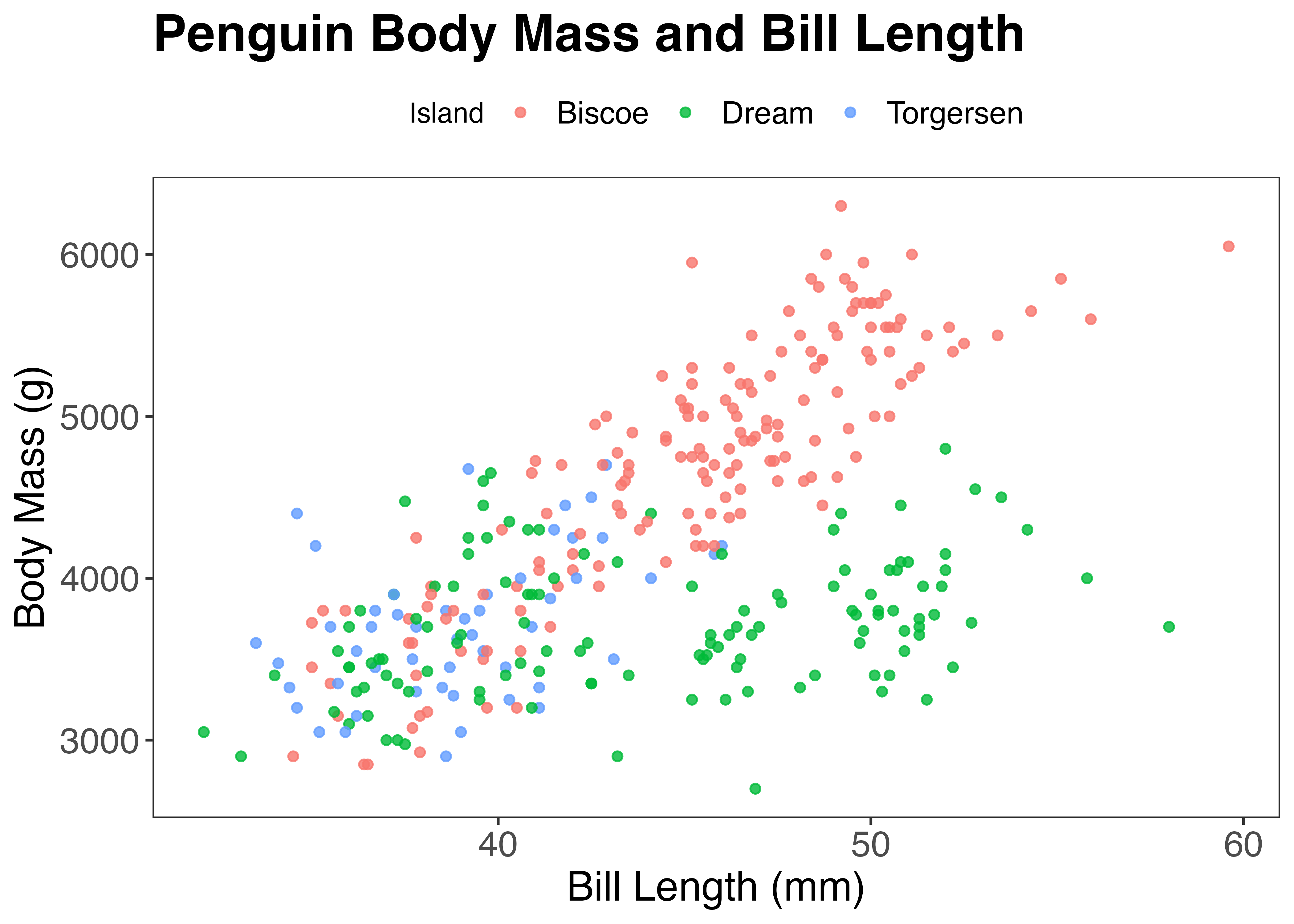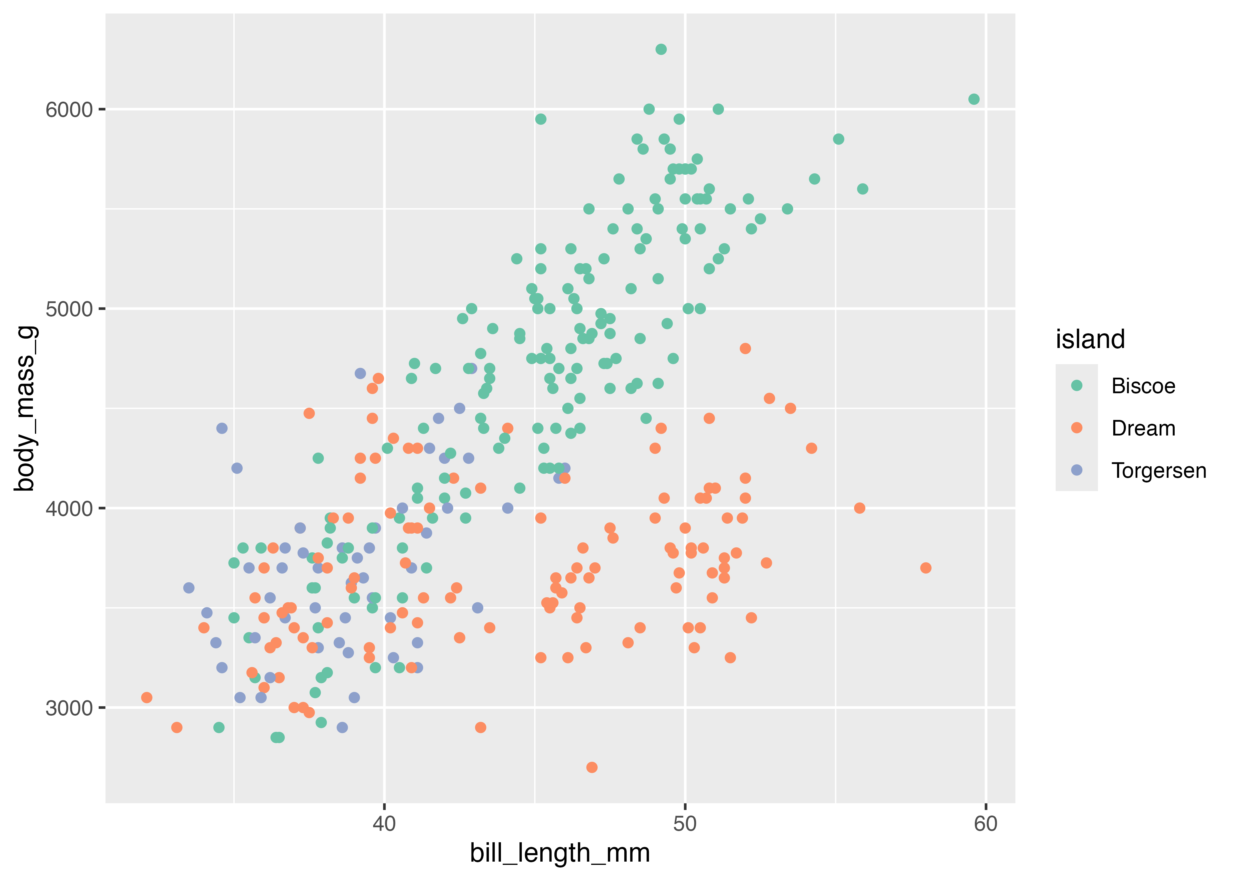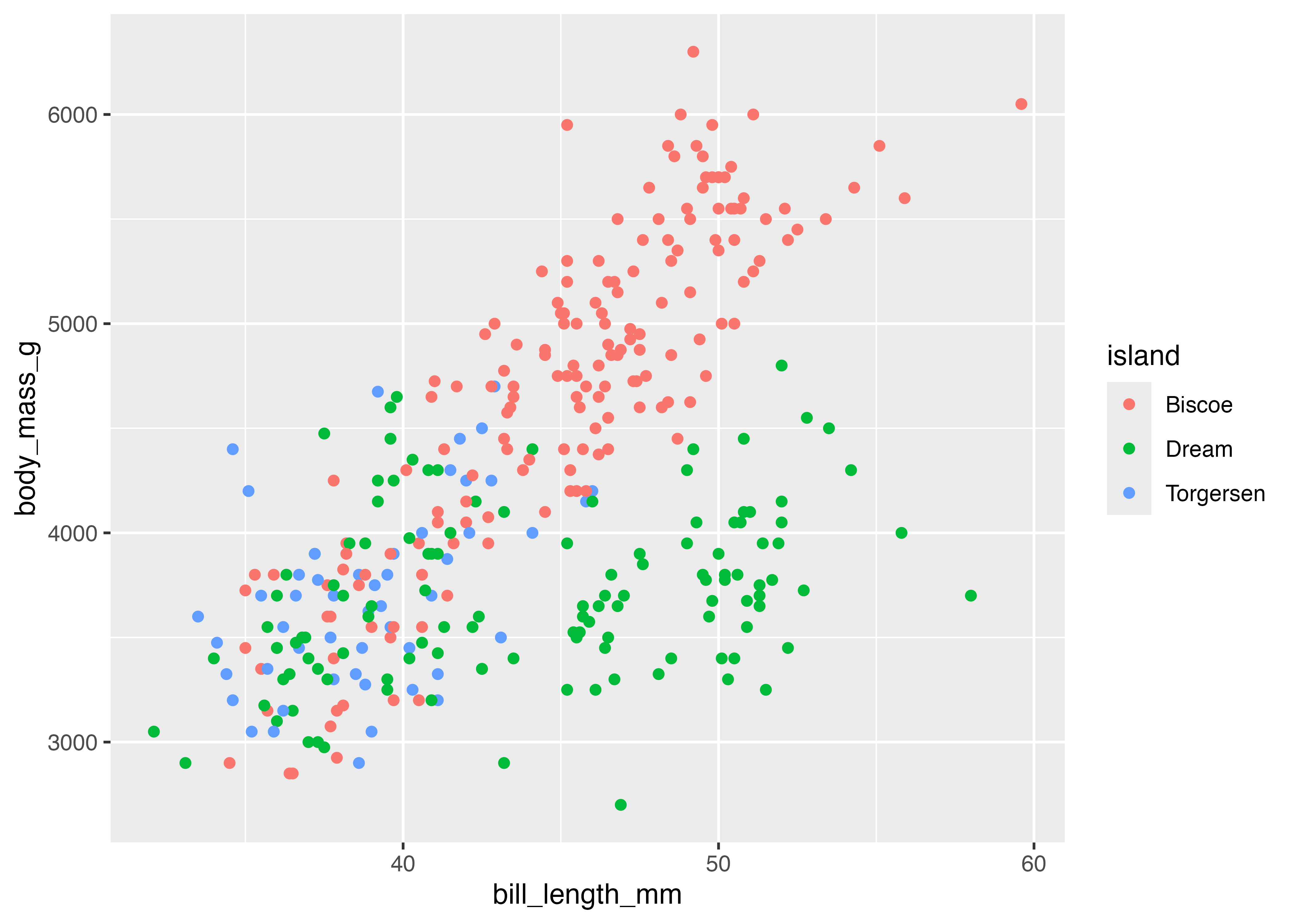 色を使って図に情報を追加しましょう。ここでは island(生息する島) ごとに color(色)をマッピングしてみます。