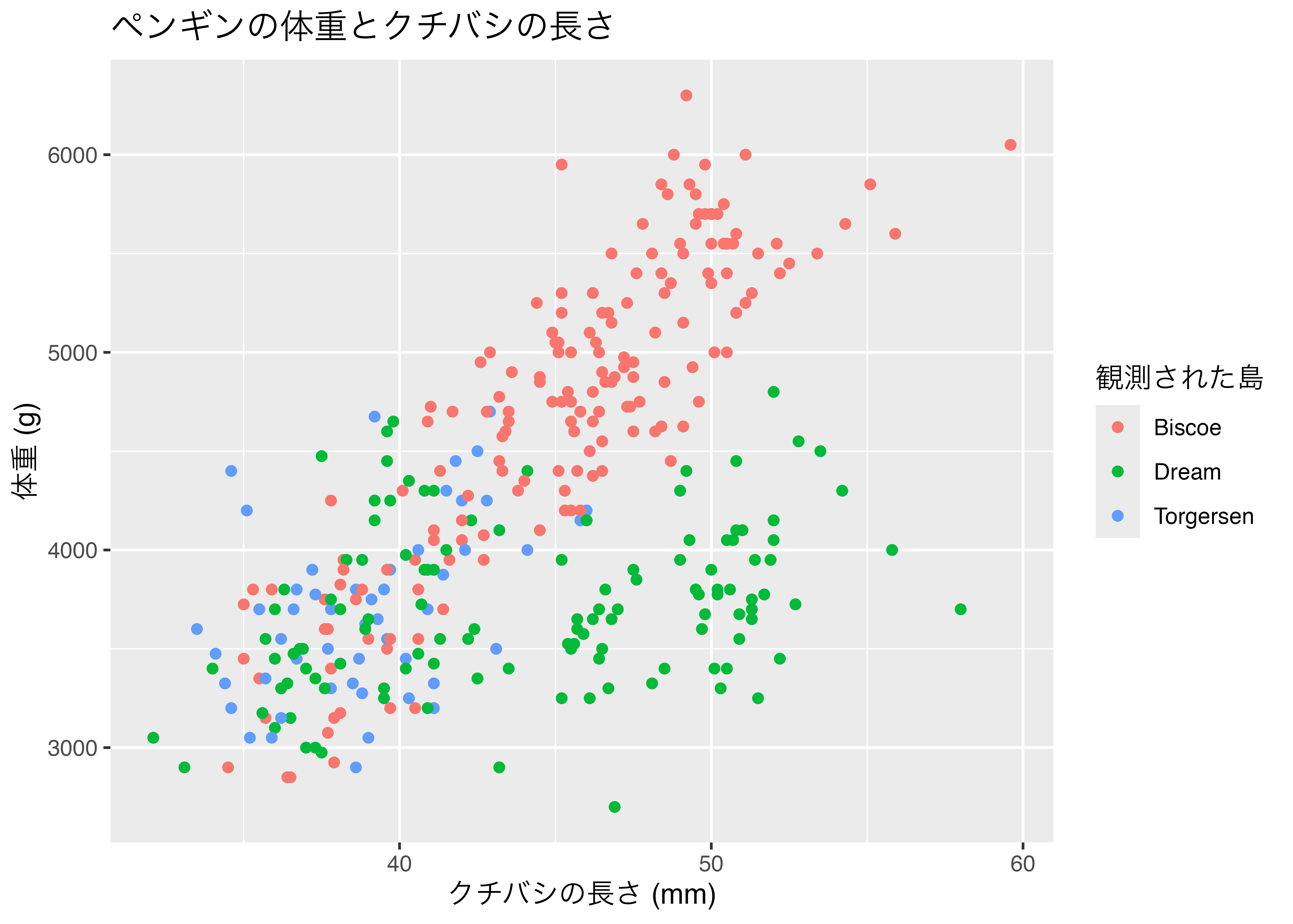 色分けしたことで、生息する島によってペンギンの特徴の分布が異なることがわかります。例えば、Biscoe島(赤色の点)ではクチバシの長さと体重の相関ははっきりしていますが、Dream島では相関があまり強くなさそうだとわかります。