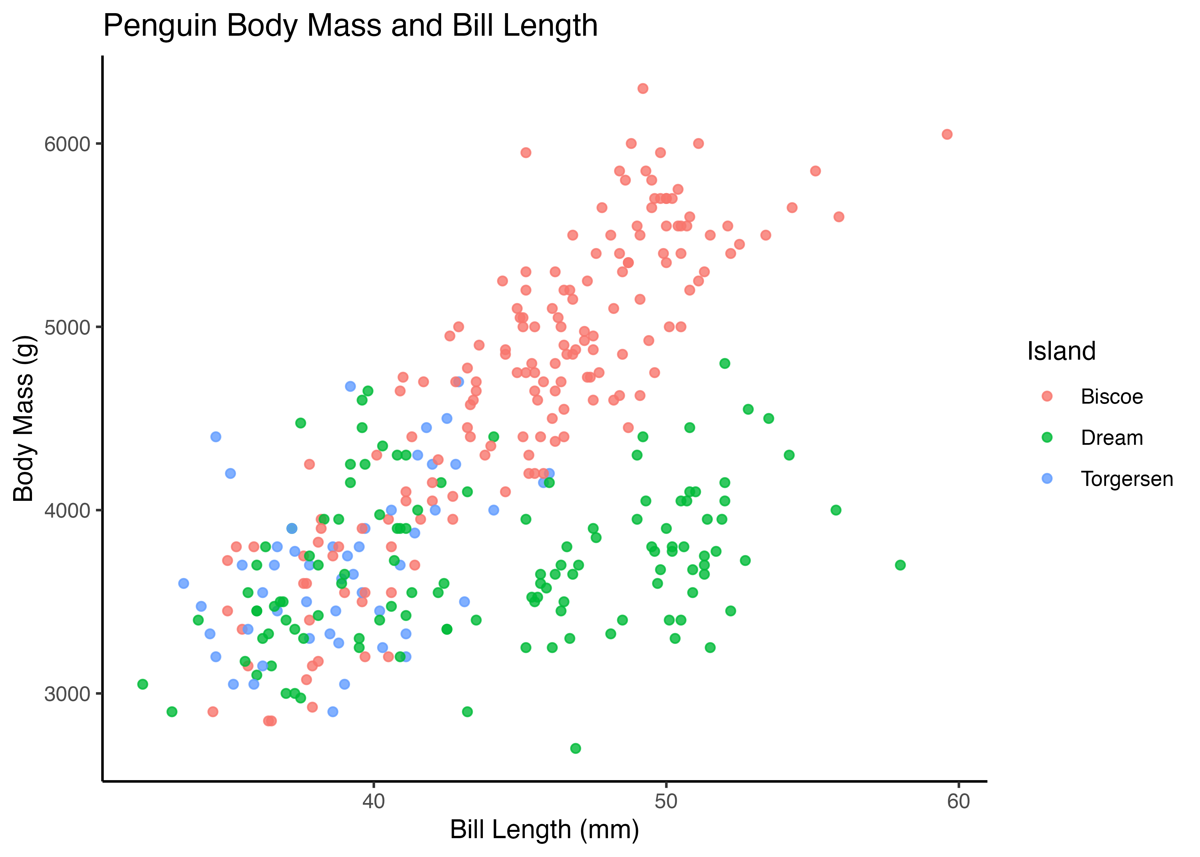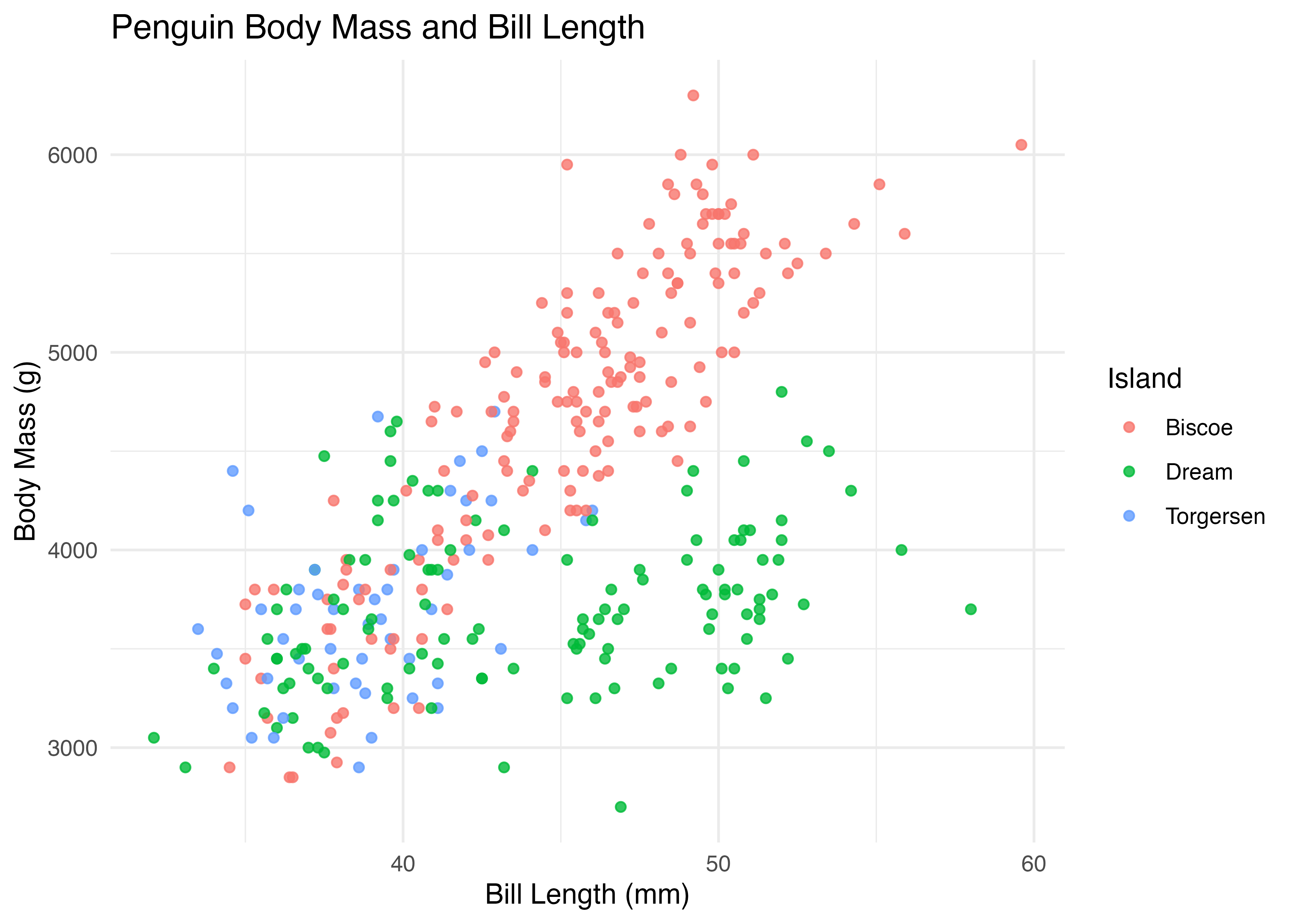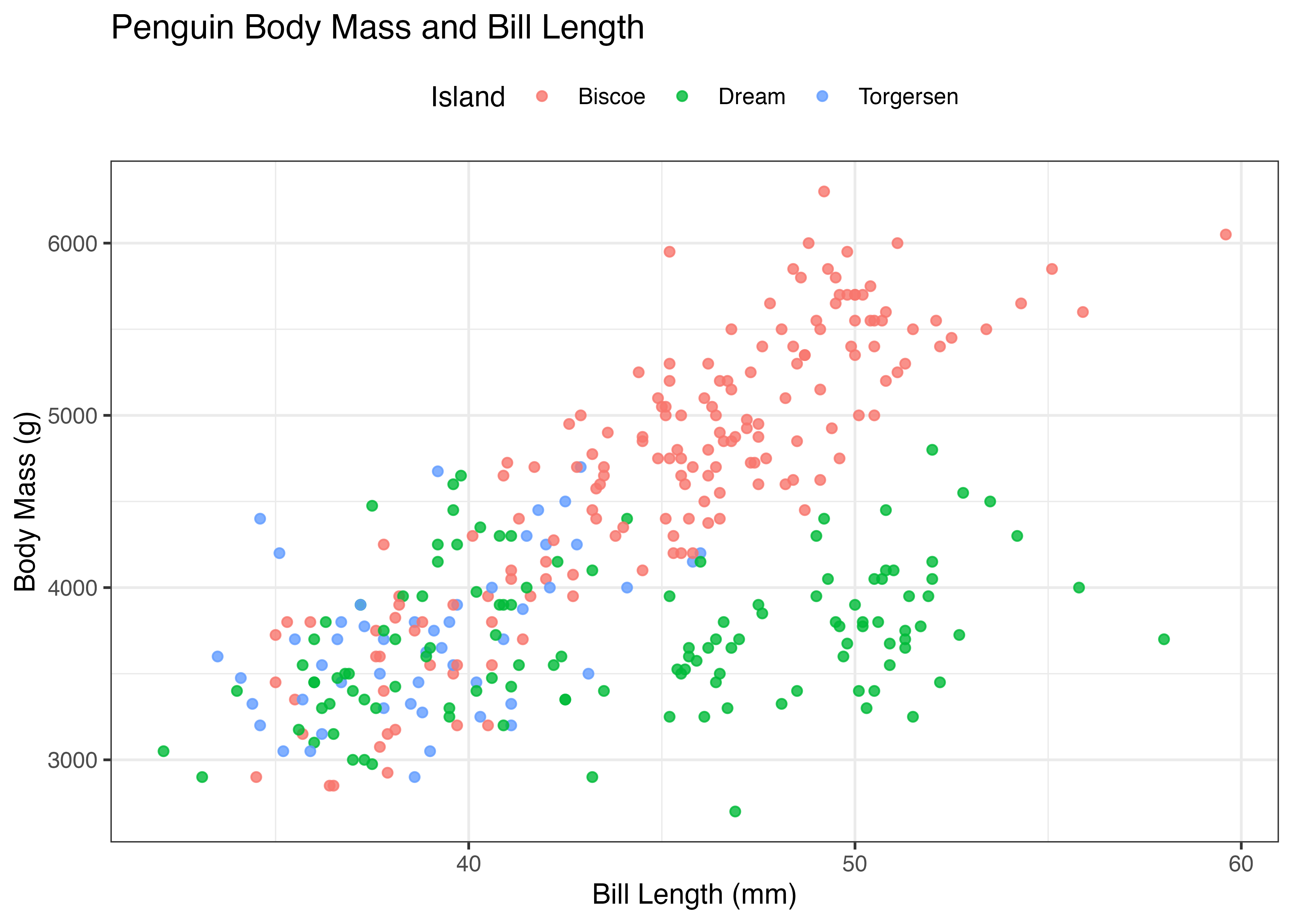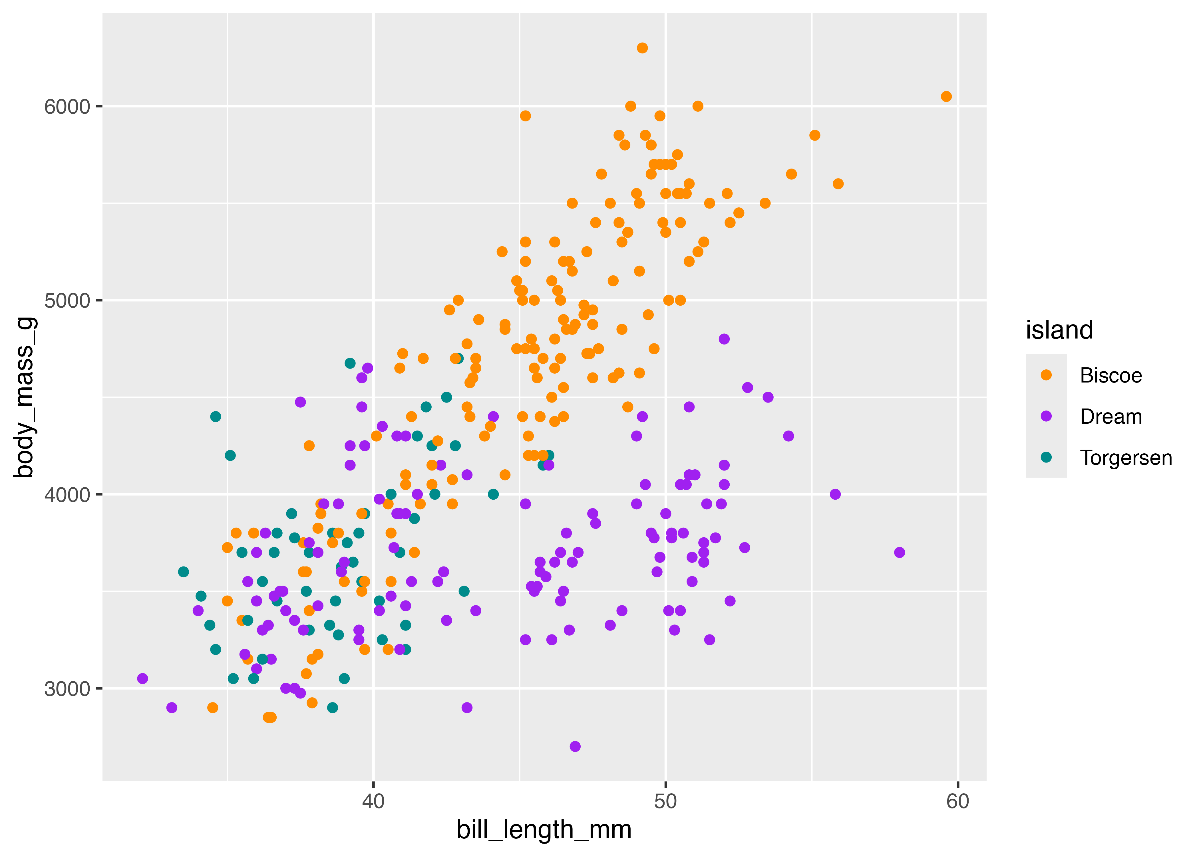 fig = ggplot(dat, aes(x = bill_length_mm, y = body_mass_g, color = island)) +