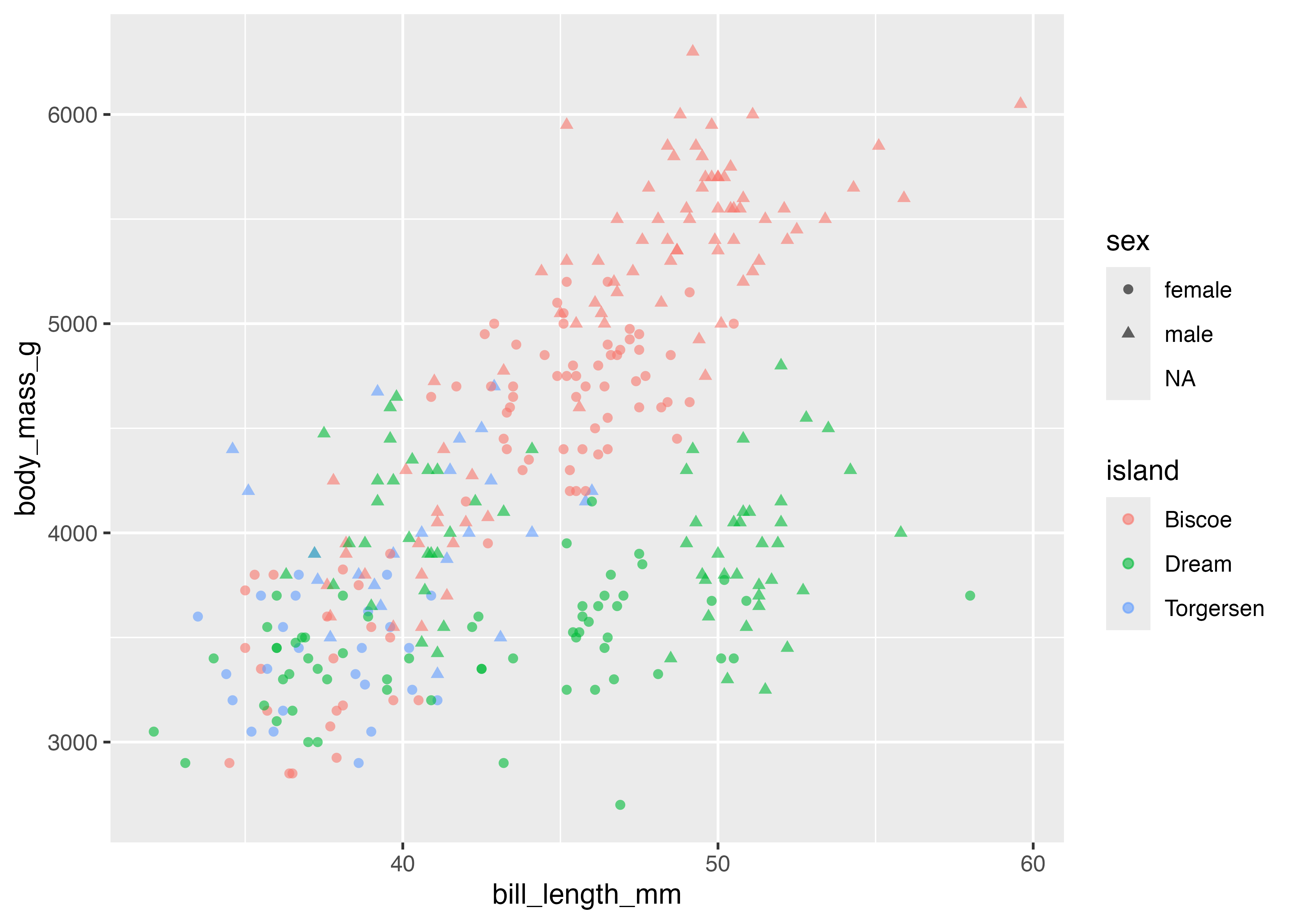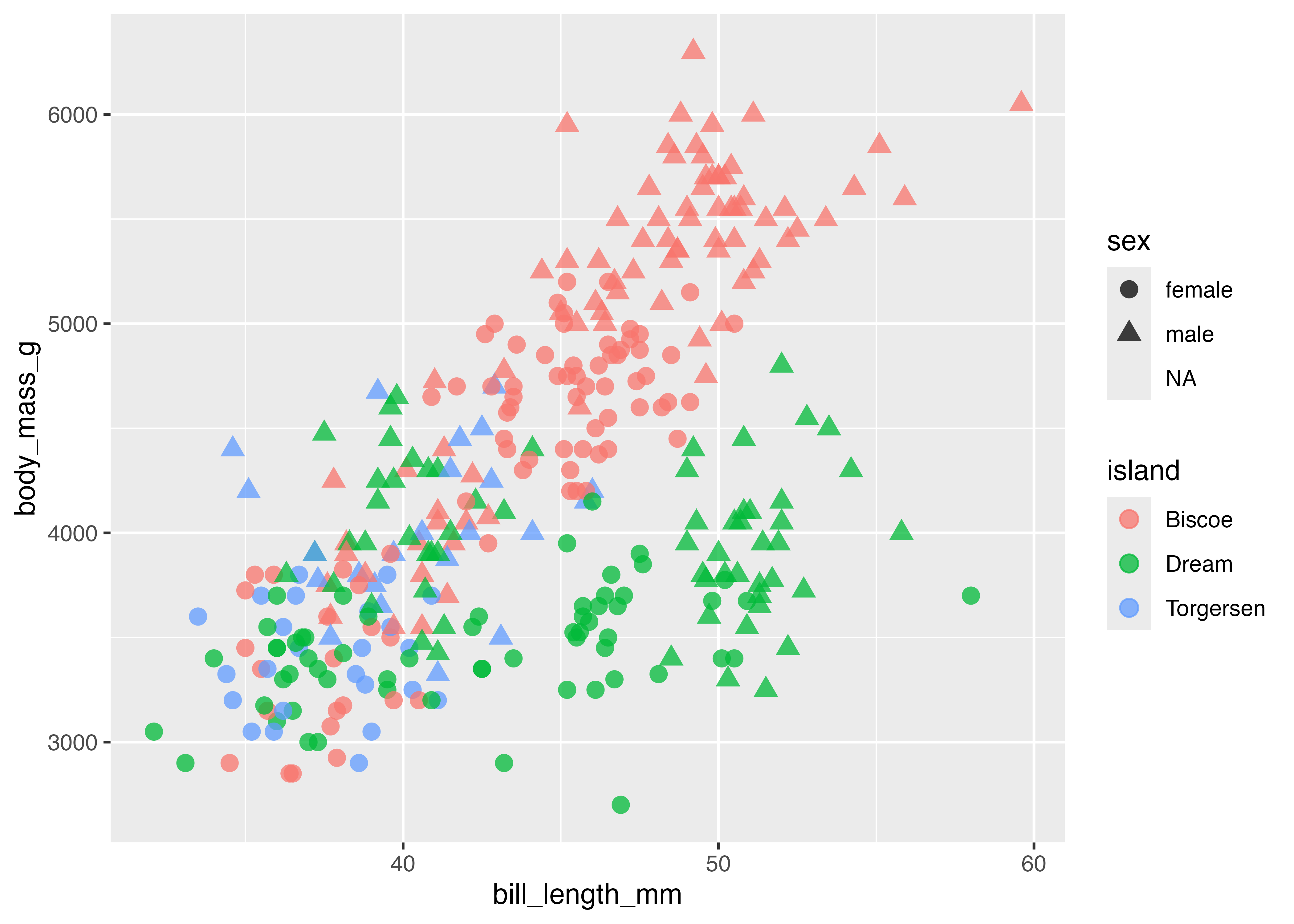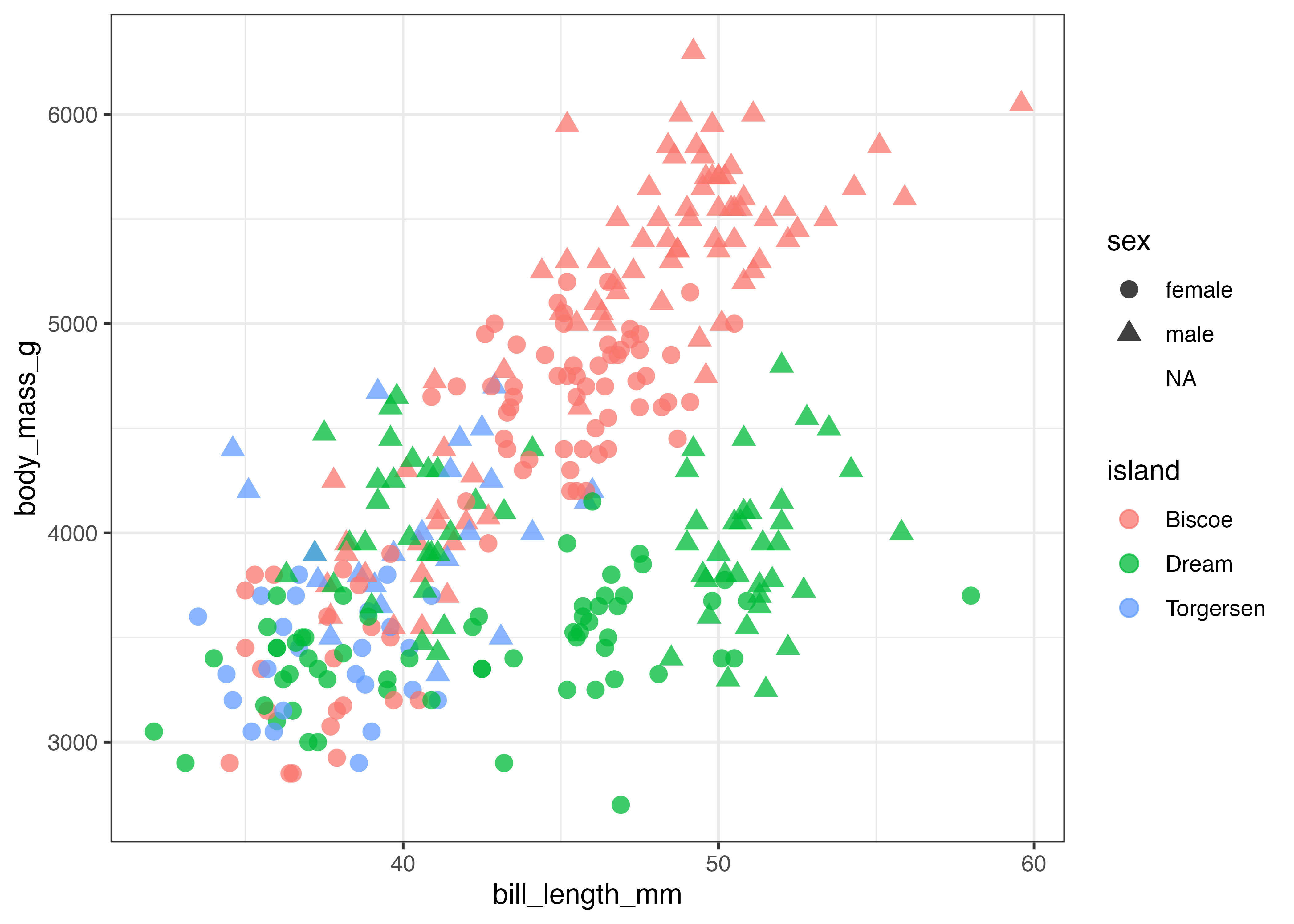 fig = ggplot(dat, aes(x = bill_length_mm, y = body_mass_g, color = island, shape = sex)) +