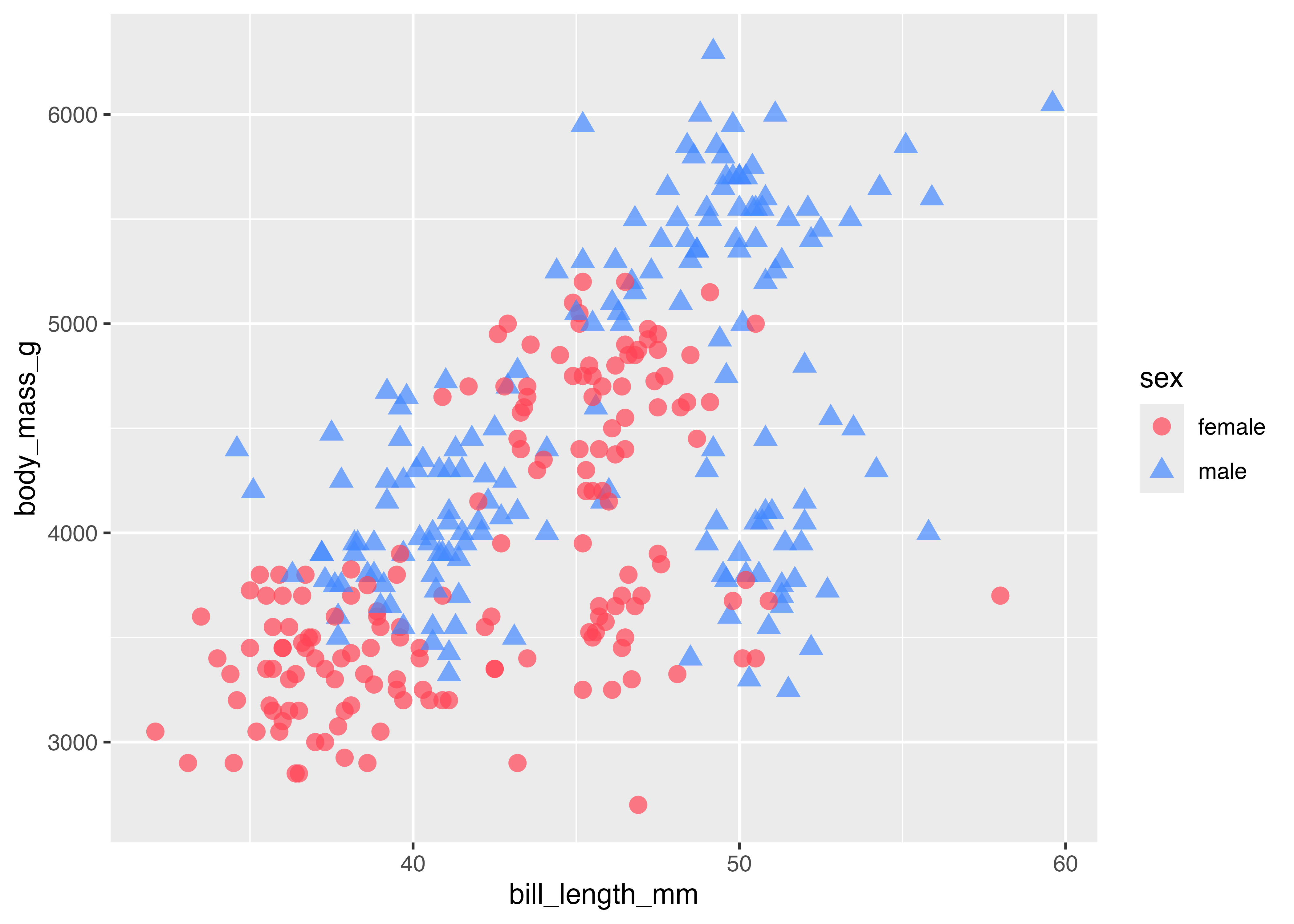 点の形状で性別が表現されています。ただ、それぞれの点が小さいせいで形の違いがよくわかりません。そこで、geom_point()の中で size(大きさ)を設定してみます。