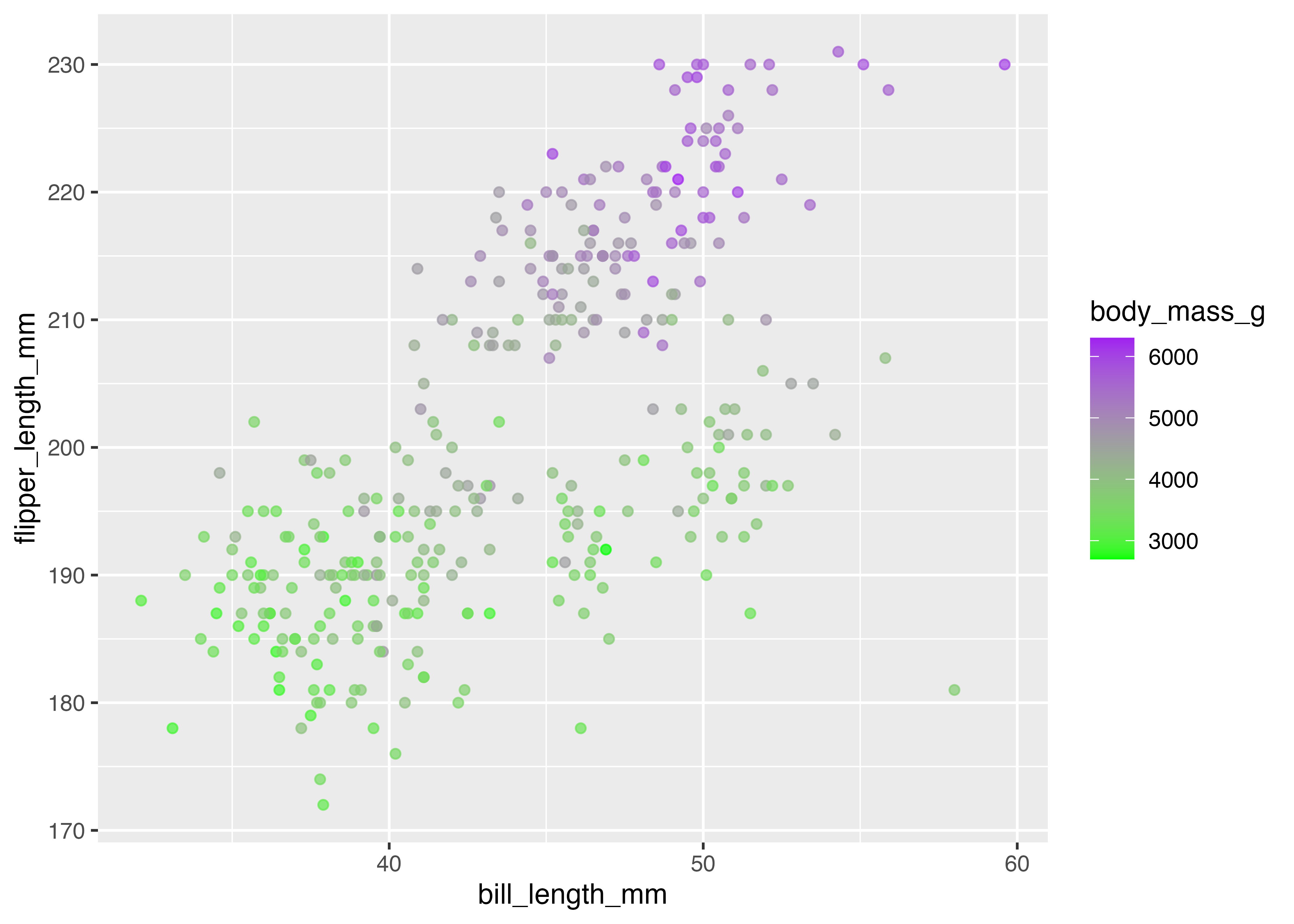 以下は散布図の点の color に、体重 body_mass_g(連続値)をマッピングした例です。