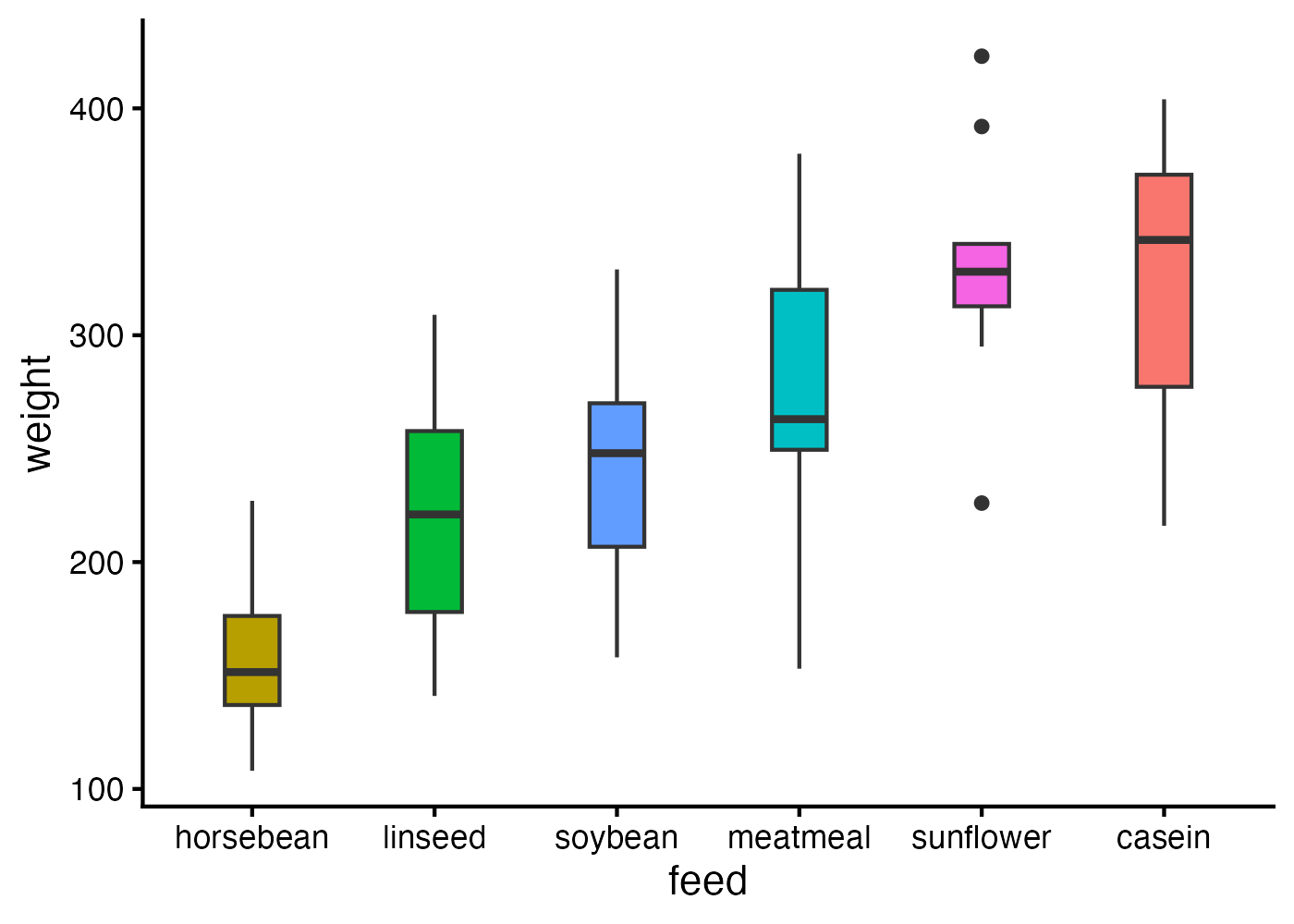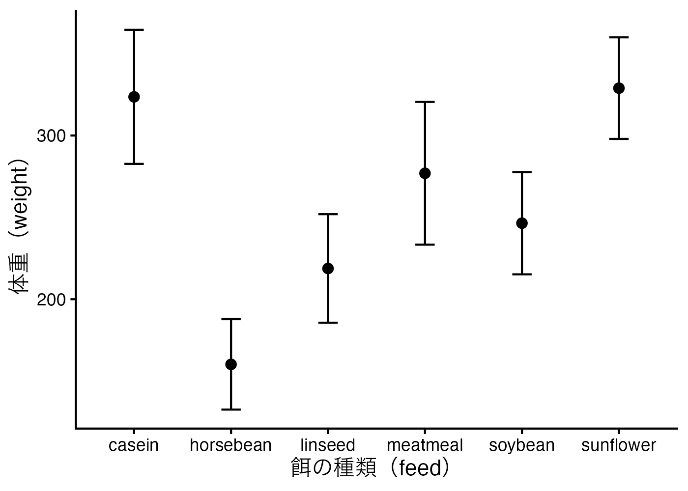 labs(x = "餌の種類(feed)", y = "体重(weight)") +