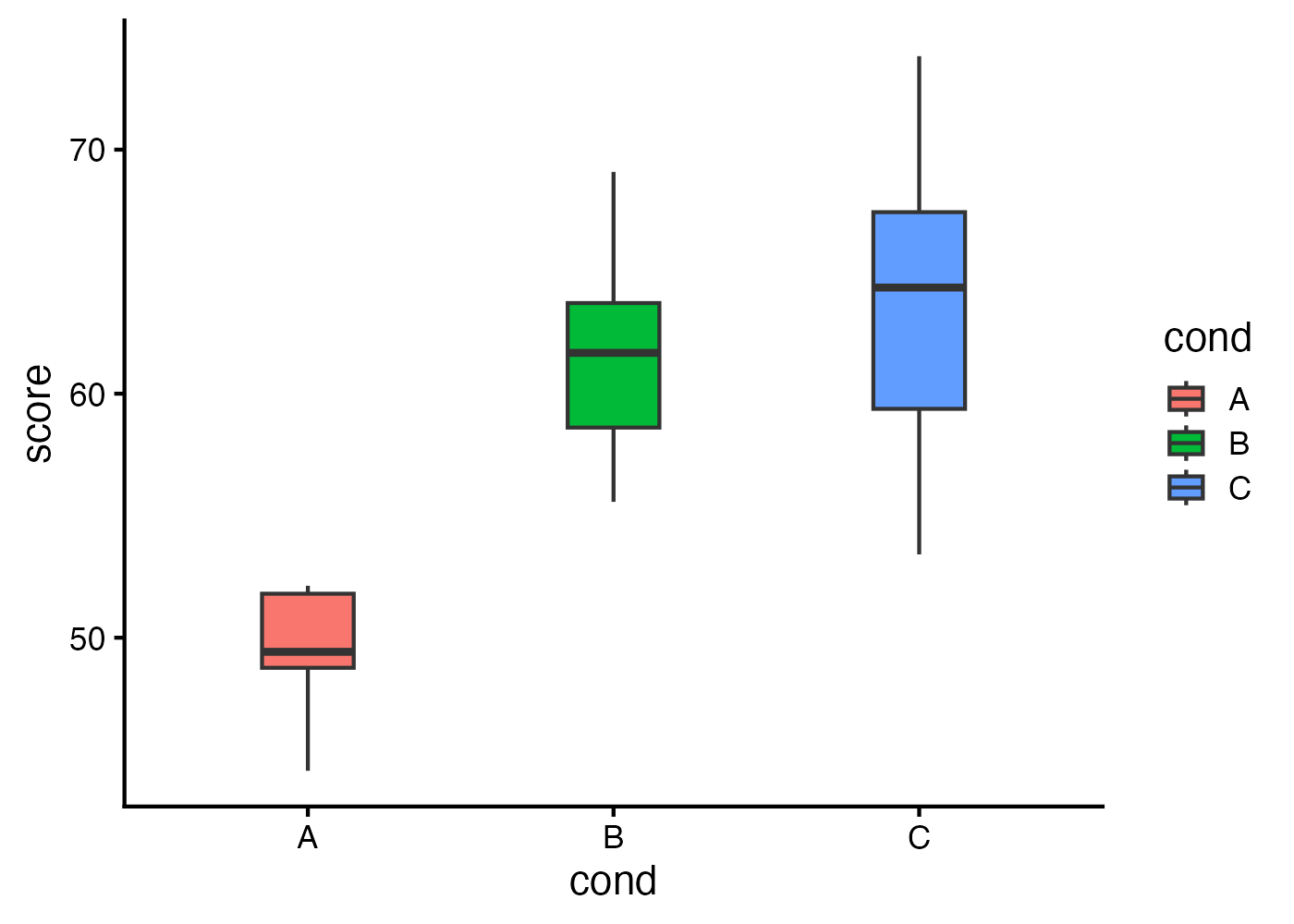 as.data.frame(main_B_summary), as.data.frame(main_B_eff))ARTでは元のデータを整列・順位変換したデータに基づいて検定を行います。したがって、箱ひげ図などで元データをそのまま表示した結果と、ARTの事後検定の結果が不整合であるように見える場合があります(図では差がないように見えるのに検定結果では差があるなど)。