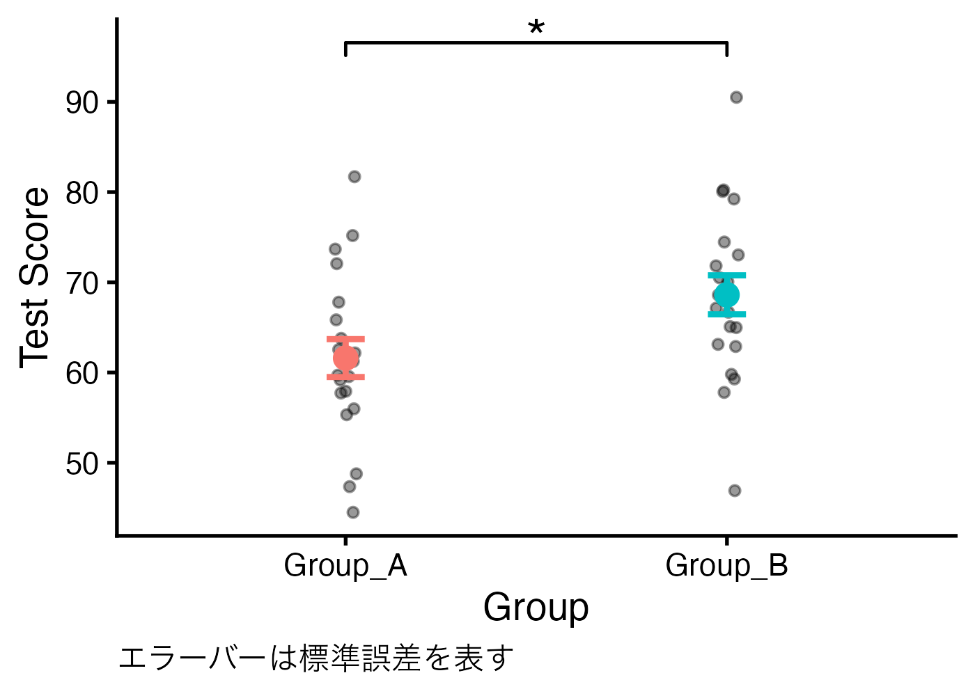 labs(y = "Test Score", x = "Group", caption = "エラーバーは95% CIを表す") +