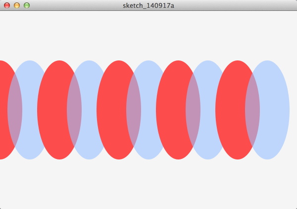 のようになっています。条件式で使われている % は割り算の余りを求めるための記号で、i を 2 で割った余りが 0 に等しいか、という条件をこの式は表現しています。i が偶数の時にこれは真となり、奇数の時に偽となります。したがって、for 文の中で i が偶数であるとき c には color(0,70,100,100) が代入され、奇数の時は color(60,40,100,60) が代入されます。結果として、色が交互に変化するような絵が描かれます。