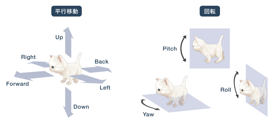 回転は、軸ごとに Yaw, Pitch, および Roll と呼ばれる回転が可能です。