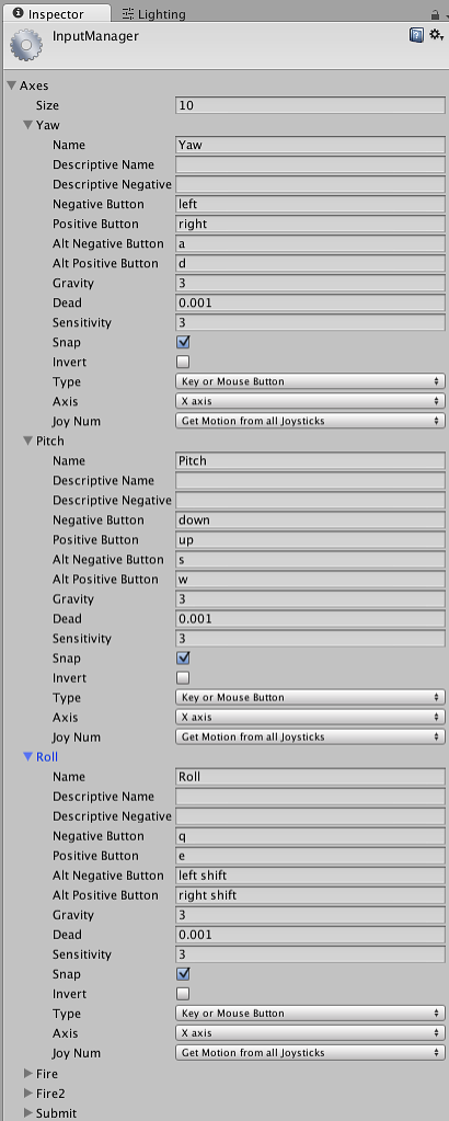 キーの変更は、回転についてはメニューから Edit > Project Settings > Input で InputManager を開き、Yaw, Pitch, Roll の各項目内の Negative Button や Positive Button を変えると変更できます。
