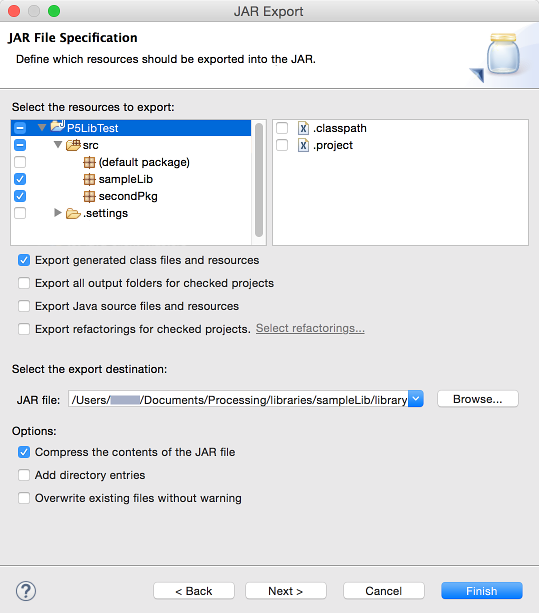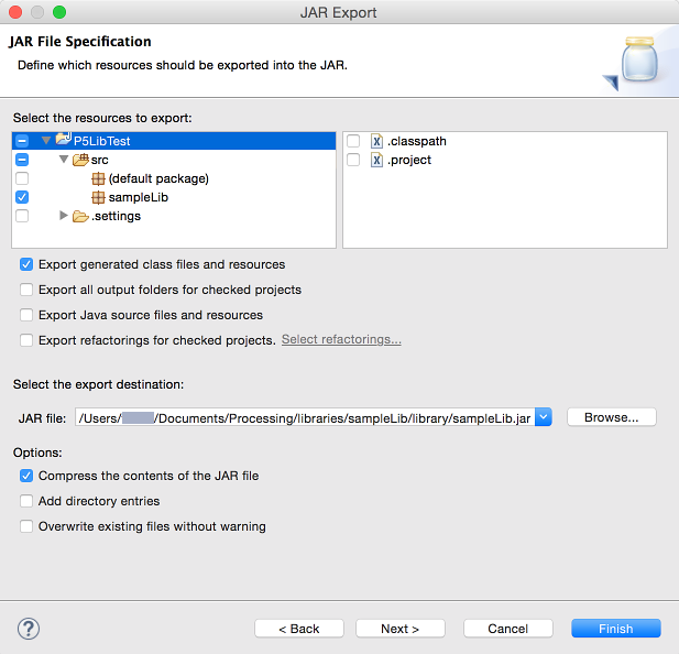 JAR file の出力ファイル名で「ライブラリ名」の部分は好きな名前を付けて下さい(ここでは sampleLib としてみましょう)。これが Processing が認識するライブラリの名前になります。jar ファイルの名前はライブラリ名と同一である必要があります。こんな感じ。