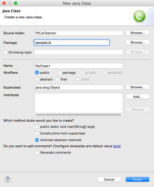 Package Explorer で P5LibTest を選択しメニューから File > New > Class を選びます。