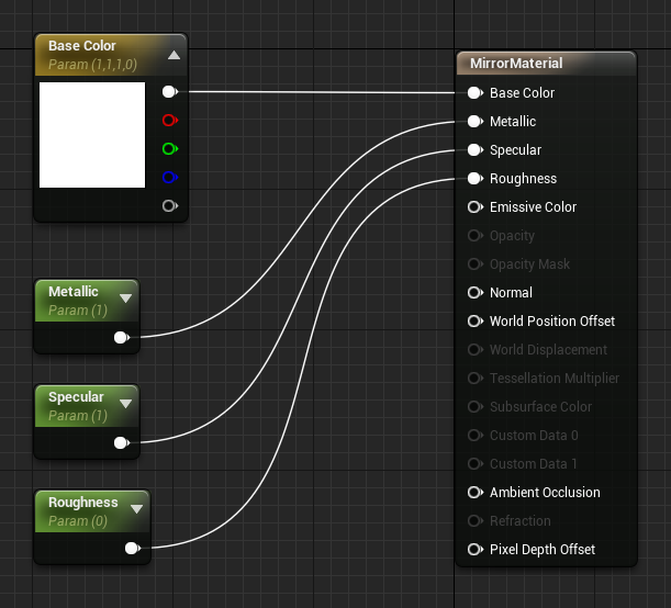 ベースカラーは白、Metallic と Specular は1、Roughness は 0 にします。