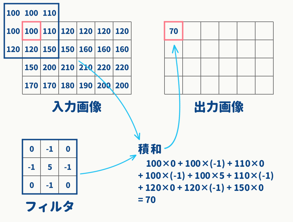 画像の画素値とフィルタ(カーネルとも呼ぶ)の重みとで積和を計算する処理のことを畳み込みと呼びます。畳み込み処理を用いた空間フィルタリングによって、画像の局所的な情報を利用した画像の変換処理が可能になります。