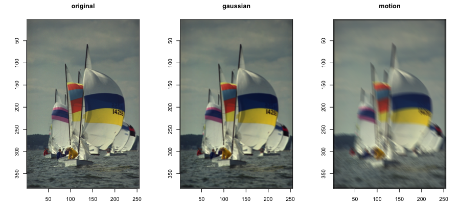 gaussianFilter = as.cimg( array( c(1,2,1,2,4,2,1,2,2), c(3,3) ) ) motionBlur = as.cimg( diag( 1/9, c( 9, 9 ) ) ) plot( imlist( original = boats, gaussian = convolve( boats, gaussianFilter ), motion = convolve( boats, motionBlur ) ), layout = "row" )