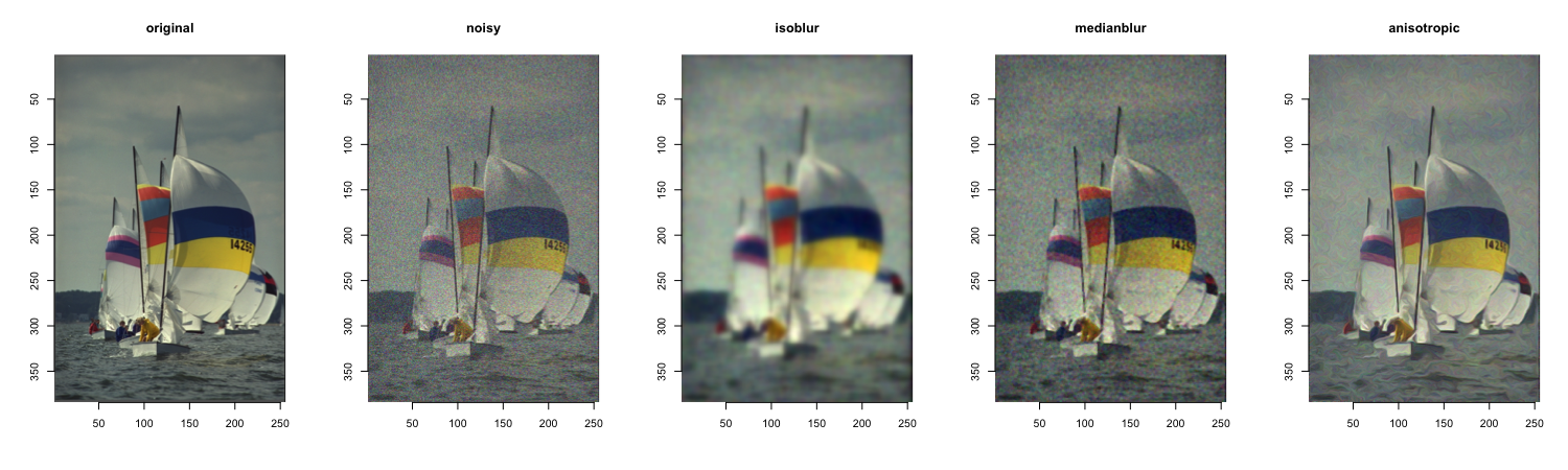 noisyBoats = ( boats + .1 * rnorm( prod( dim( boats ) ) ) ) plot( imlist( original = boats, noisy = noisyBoats, isoblur = isoblur( noisyBoats, 3 ), medianblur = medianblur( noisyBoats, 3 ), anisotropic = blur_anisotropic( noisyBoats, ampl = 1e4, sharp = 1 ) ), layout = "row" )