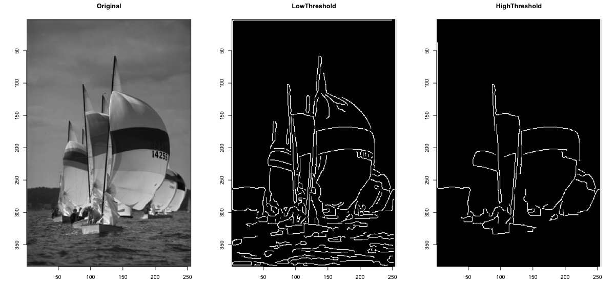 cannyEdges( boats ) %>% plot cannyEdges( boats, alpha = 0.4) %>% plot # Make thresholds less strict cannyEdges( boats, alpha = 1.4) %>% plot # Make thresholds more strict plot( imlist( Original = grayscale( boats ), LowThreshold = as.cimg( cannyEdges( boats, alpha =.4 ) ), HighThreshold = as.cimg( cannyEdges( boats, alpha = 1.4 ) ) ), layout = "row" )