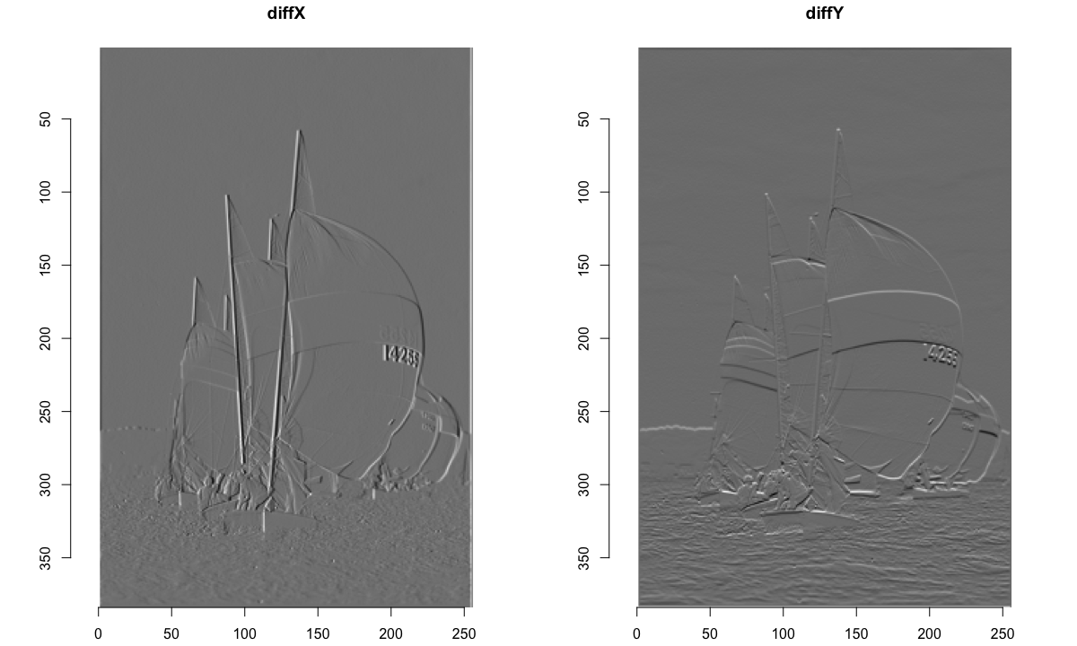 # 画素値の勾配は imgradient 関数を使って得るのが手軽で良い gradients = imgradient( boats, "xy", scheme = 2 ) # scheme の値でどのようなフィルタを使うかを指定する #-1 = Backward finite differences # 0 = Centered finite differences # 1 = Forward finite differences # 2 = Using Sobel masks # 3 = Using rotation invariant masks # 4 = Using Deriche recursive filter # 5 = Using Van Vliet recursive filter