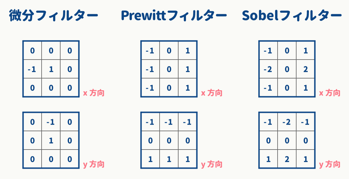 横方向に勾配を取る際に同時に縦方向には平滑化処理を行う方法もあり、平滑化の方法によってプリューウィットフィルタやソーベルフィルタなどがよく知られています。