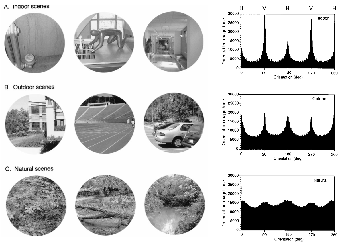 Coppolaらは風景画像を分析し、屋内や屋外など建築物のある風景だけでなく、人工物の無い自然風景においても水平・垂直な方位成分が多く含まれることを示しました。