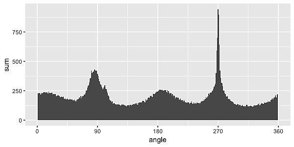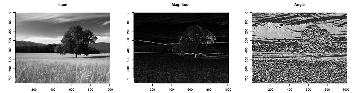 library( imager ) library( dplyr ) library( ggplot2 ) # prepare an image img = load.image( "img/scene.png" ) img = imappend( list( R(img), G(img), B(img) ), axis = "c" )%>% grayscale() %>% imresize( scale = .5 ) %>% isoblur( 2 ) # calculate edge magnitudes and angles gradients = imgradient( img, "xy", scheme = 2 ) magnitude = sqrt( gradients$x^2 + gradients$y^2 ) angle = atan2( gradients$y, gradients$x ) angleDeg = round( ( angle + pi ) * 180 / pi ) plot( imlist( input = img, Magnitude = magnitude, Angle = angleDeg ), layout = "row" ) # calculate the distribution of edge orientation dm = data.frame( angle = as.vector( angleDeg ), magnitude = as.vector( magnitude ) ) %>% dplyr::group_by( angle ) %>% dplyr::summarise( sum = sum( magnitude ) ) fig = ggplot( dm, aes( x = angle, y = sum ) ) + geom_bar( stat = "identity", width = 1 ) + scale_x_continuous( limits = c( 0, 360 ), breaks = 0:360*90 ) plot( fig )