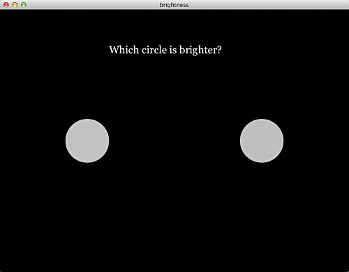 この実験課題は、心理実験の課題としてはさほど意味のある課題ではありません。輝度の弁別閾の計測課題に近いですが、提示される円の輝度は毎試行でランダムとしているので、あまり統制された実験とはなっていません。