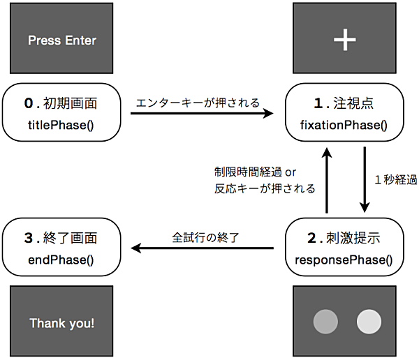 一般に、実験プログラムの流れはいくつかの画面(状態)が切り替わって行くことで進行します。今回の実験の場合、実験全体の流れを以下の4つの状態に分割することができます。