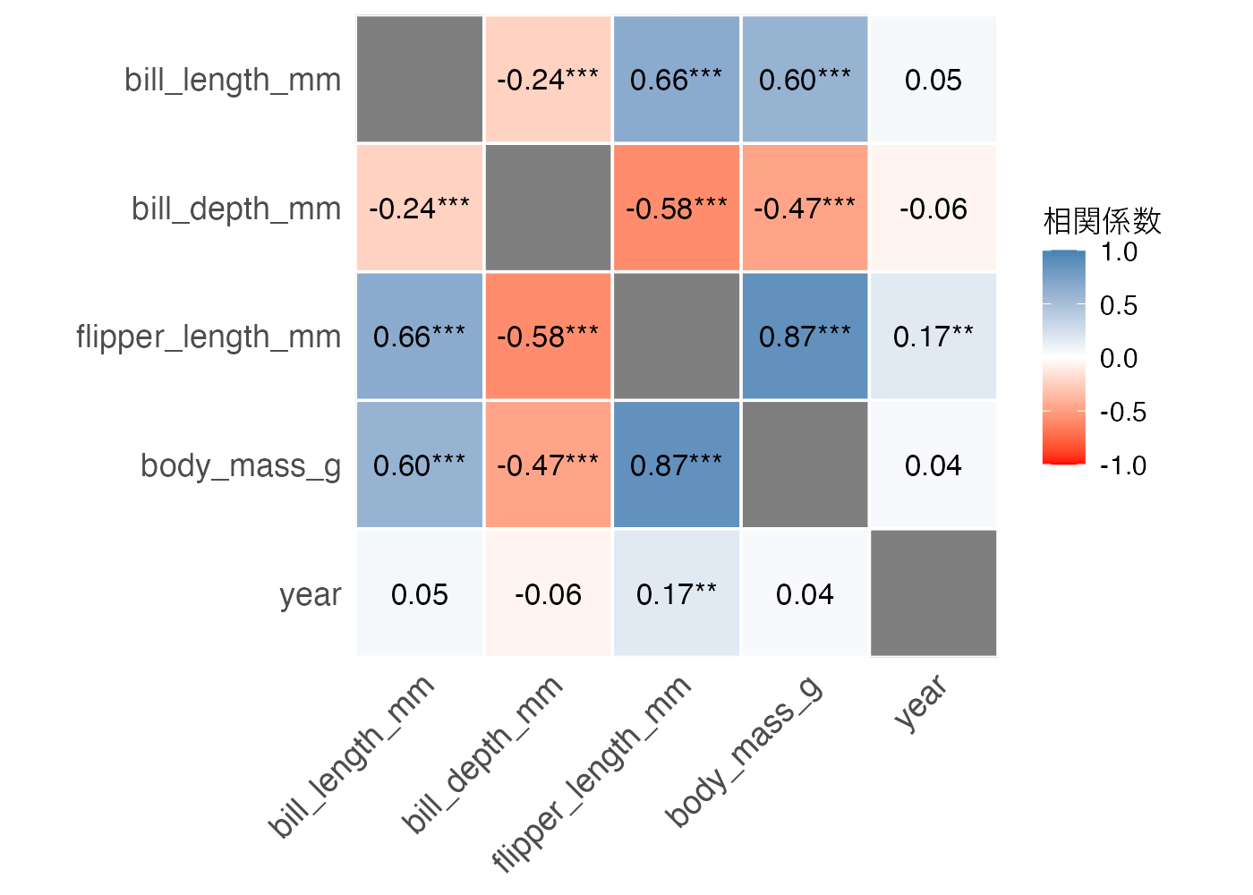 この図ですべての変数間の関係性が一望できます。見方は以下の通りです。
