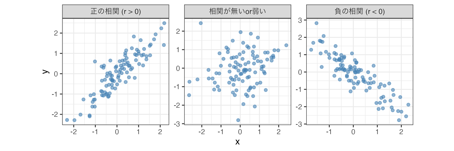 相関係数を計算する際は図(散布図)を描くことが重要です。相関係数の値だけしか見ない場合、変数間の関連性について誤解をしてしまう場合があるからです。