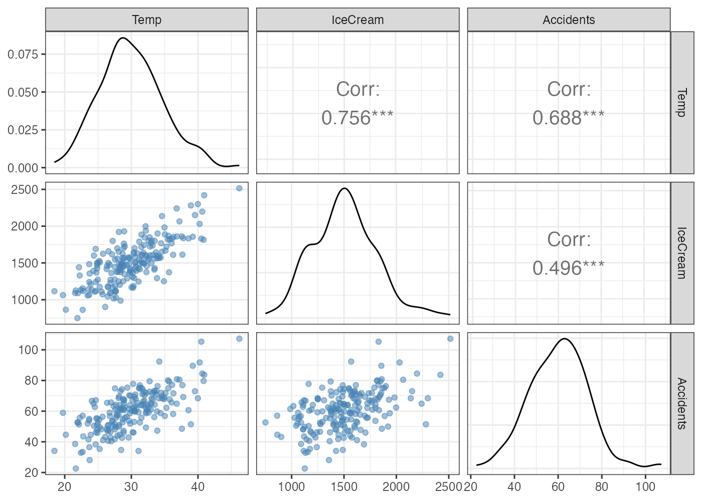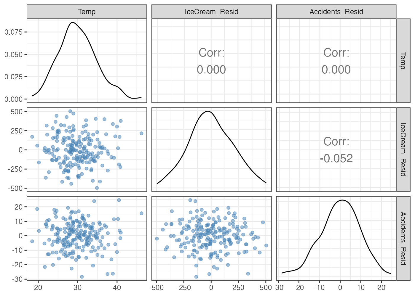なお、気温はアイスの残差や事故の残差とは無相関になります。気温によってアイスや事故を回帰したので、これは必然的な結果です。
