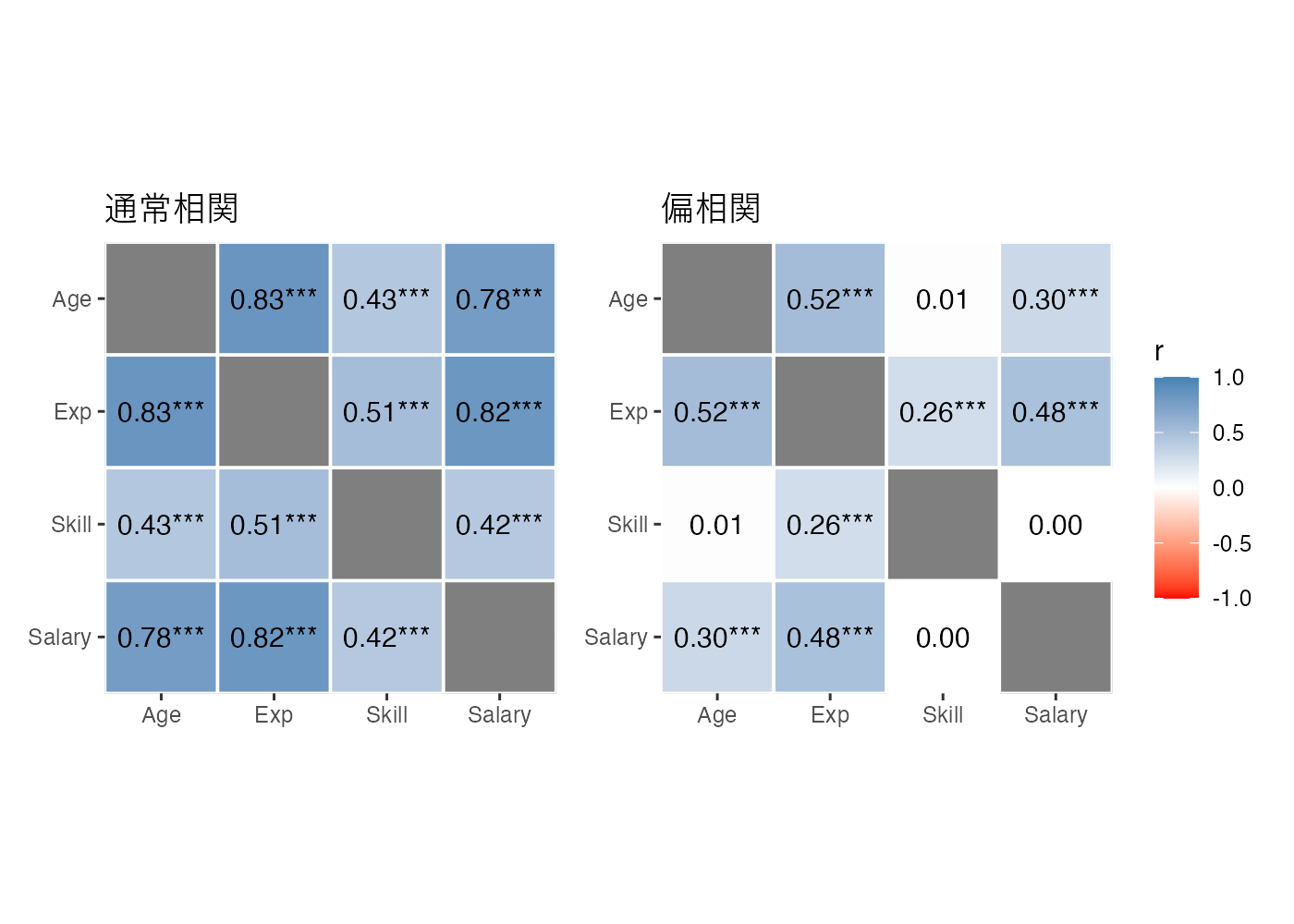 通常の相関ではスキルと給与の間に有意な正の相関(r = .42)が見られます。しかし、偏相関を使い、年齢や経験の影響を統制した場合、その相関はほぼ0になりました。