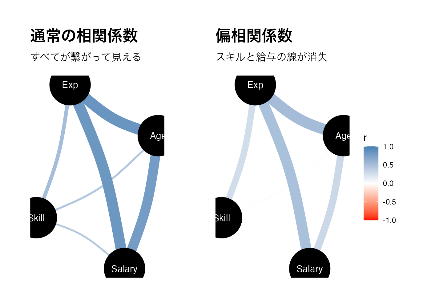 labs(title = "偏相関係数", subtitle = "スキルと給与の線が消失")