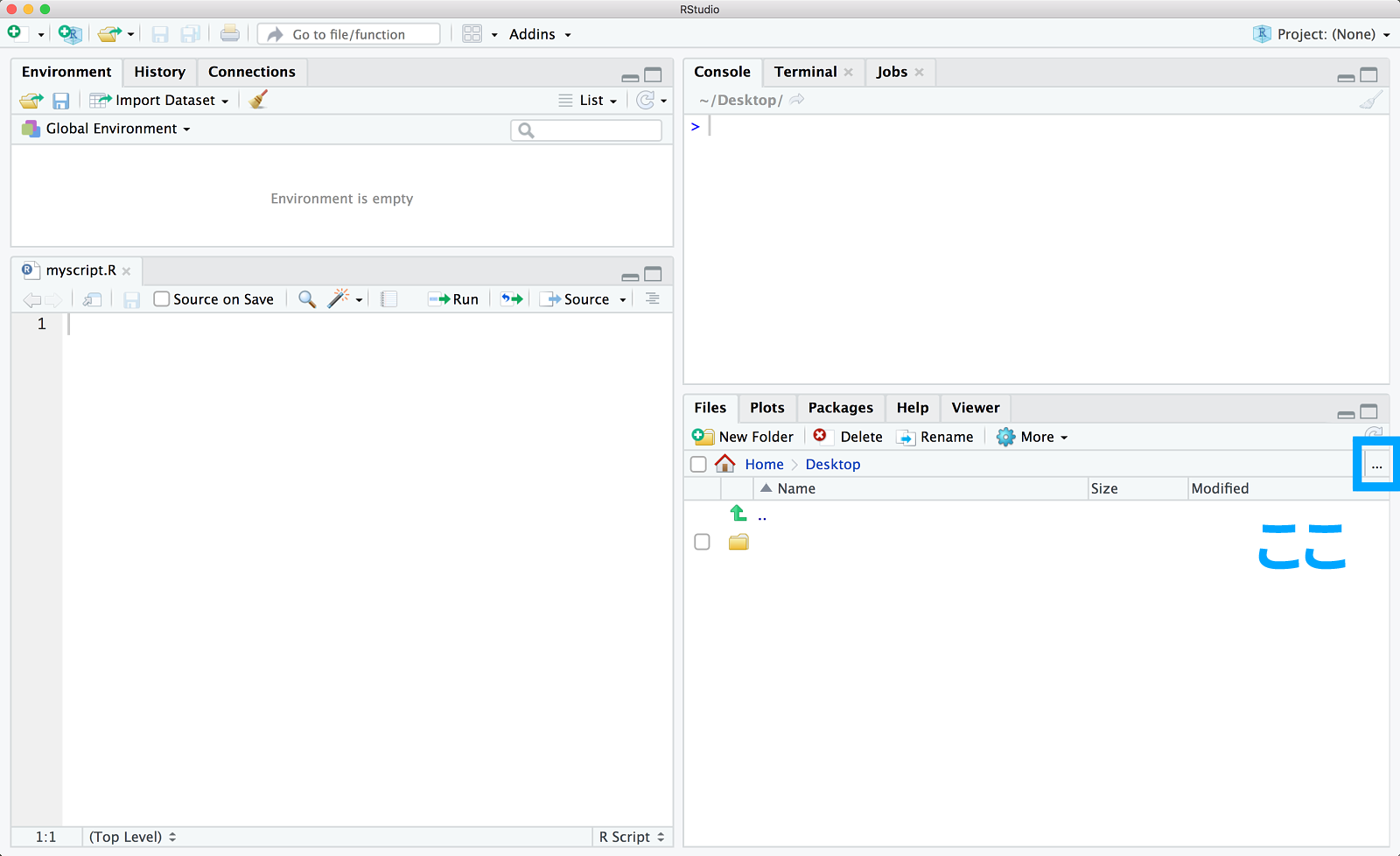 working directory を設定する方法はいくつかありますが、簡単なのは Files タブの More アイコンを使う方法です。まず、Files タブに working directory に設定したいフォルダを表示させます(上の手順をやっているならすでにそうなっています)。