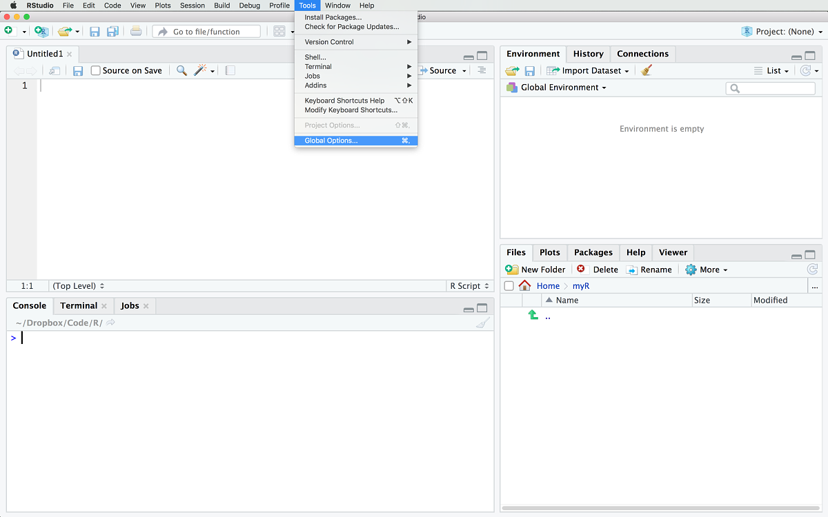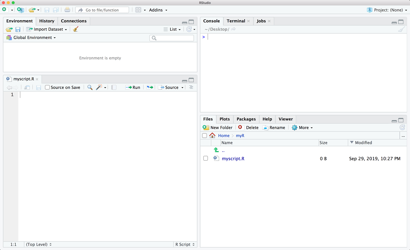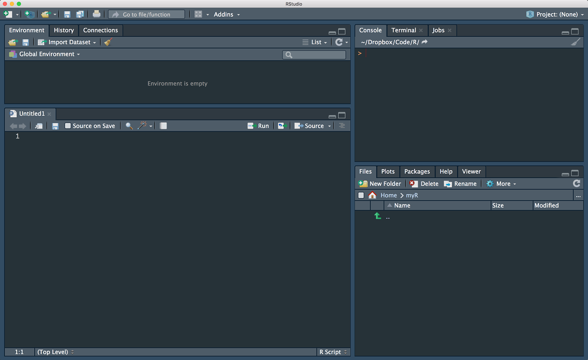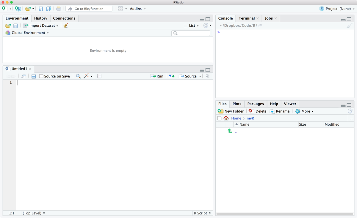 下図の例だと、パソコン内の Home という場所に myR という名前の R 用フォルダを作っており、そこに myscript という名前の R スクリプトがあります。