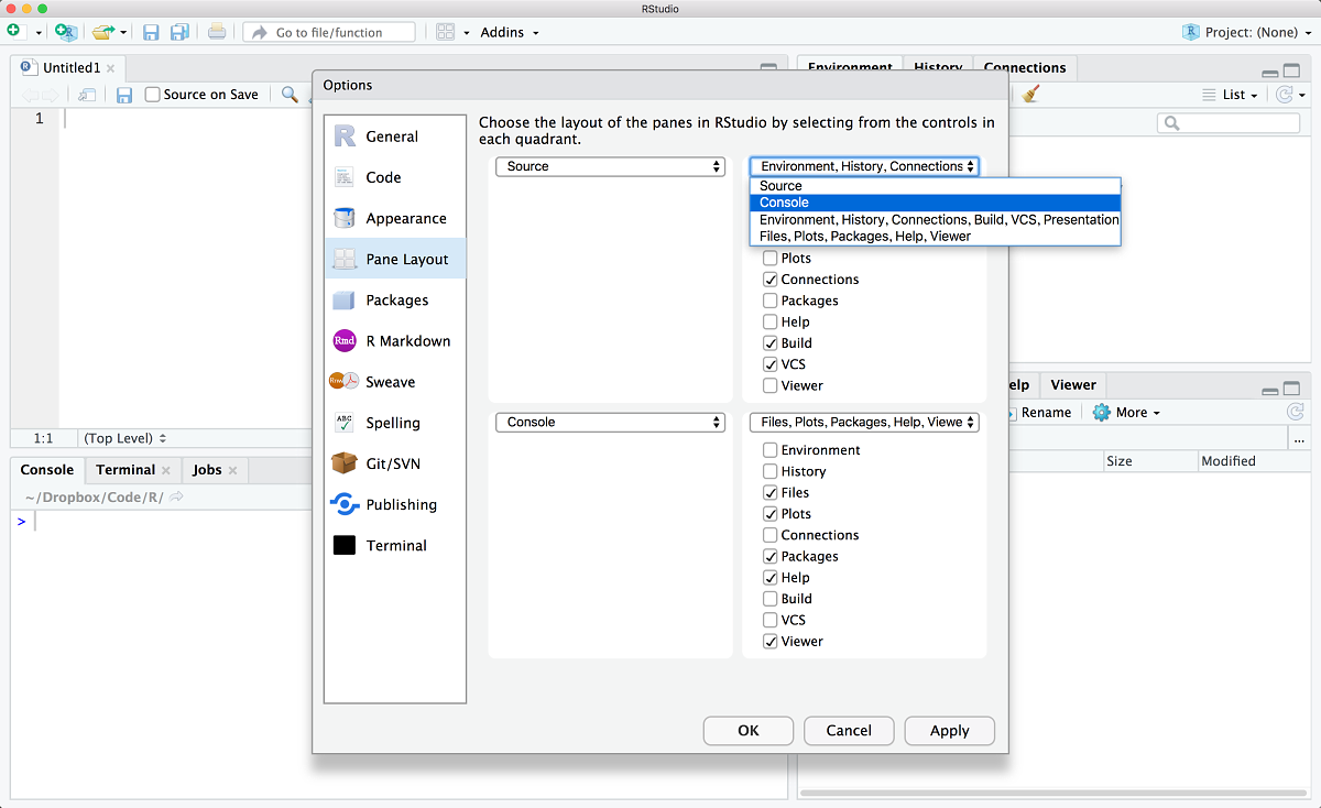 RStudio に慣れてきたら自分にとって使いやすい配置を考えると良いでしょう。