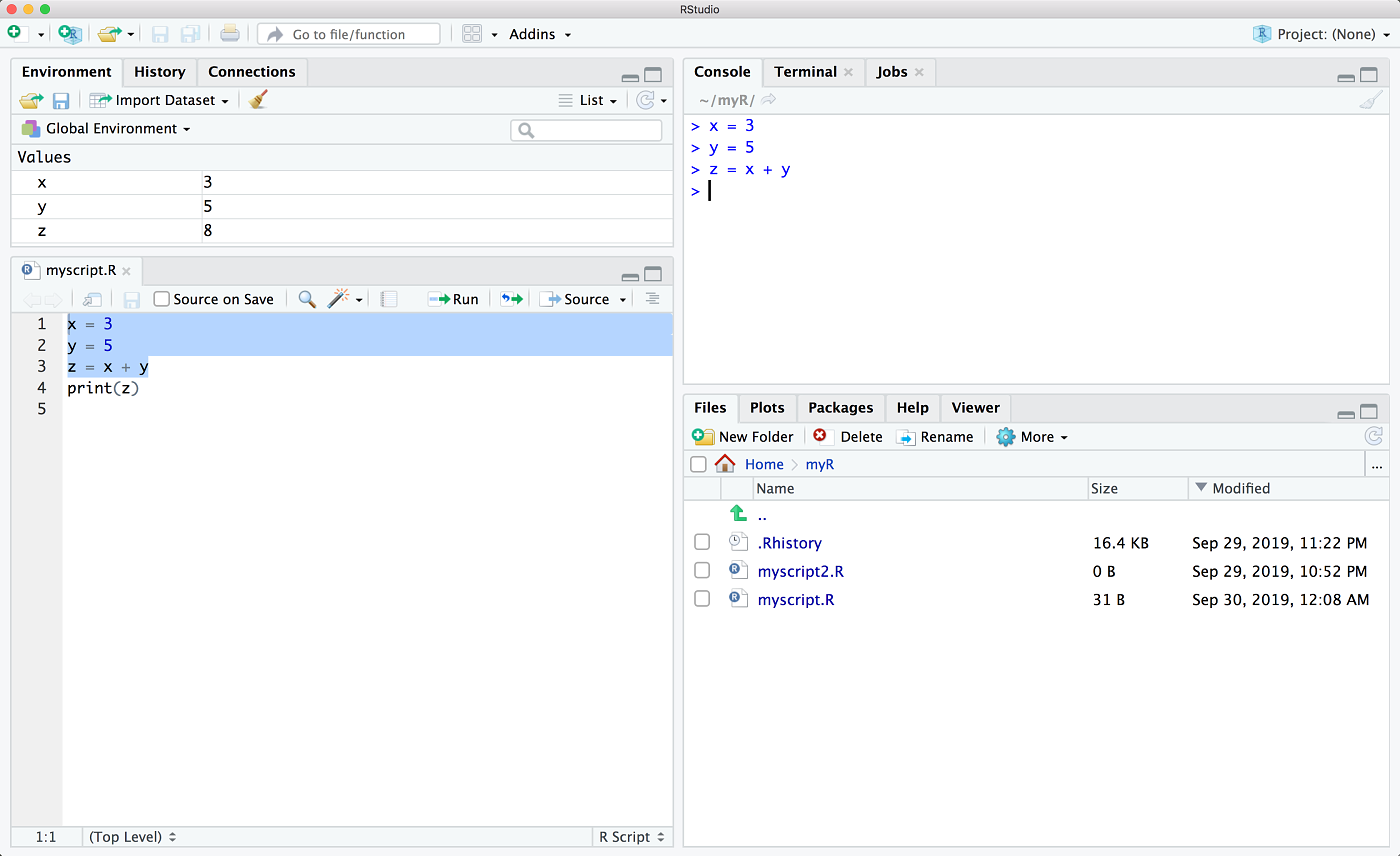 スクリプトの内容を全てまとめて実行したい場合は Source、一部分だけを実行したい場合は Run を使いましょう。