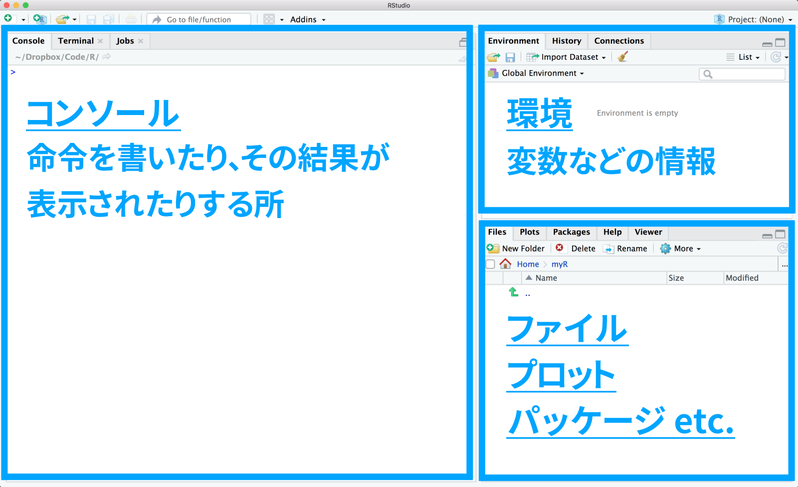 R だけでも(RStudio を使わなくても)R による統計解析は可能ですが、RStudio には R を便利に使うための機能が豊富に用意されているため、多くの人が RStudio を利用して R による統計解析の作業を行なっています。