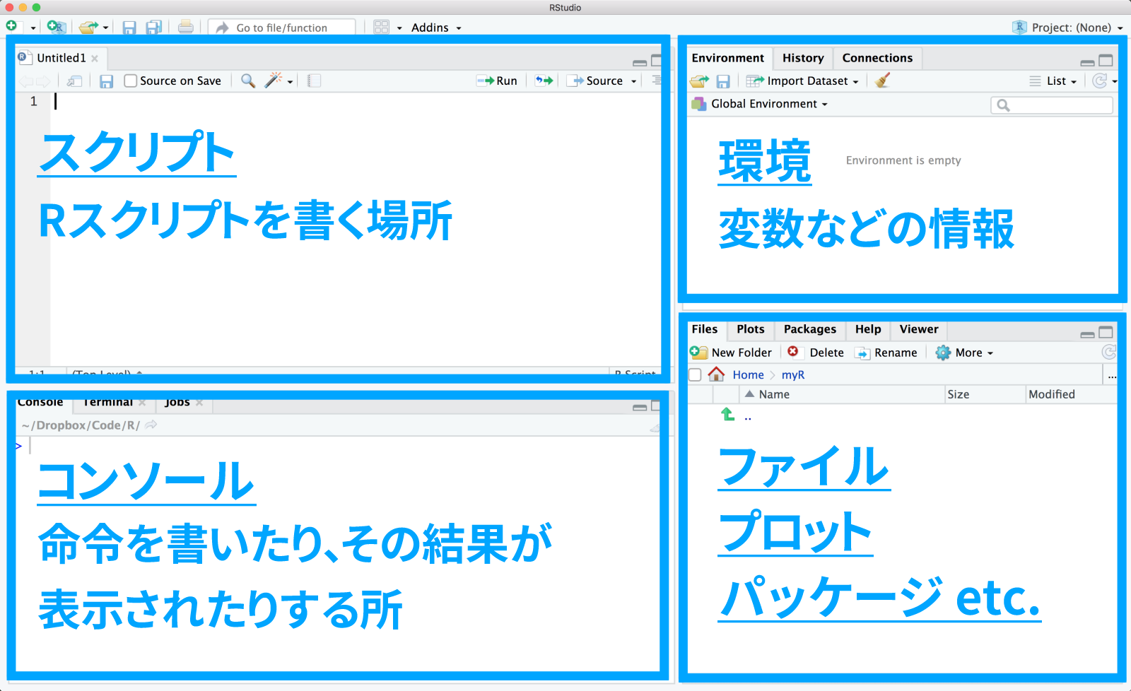 このように画面が4つに分割された状態が RStudio で作業をする時の基本的な画面構成です。