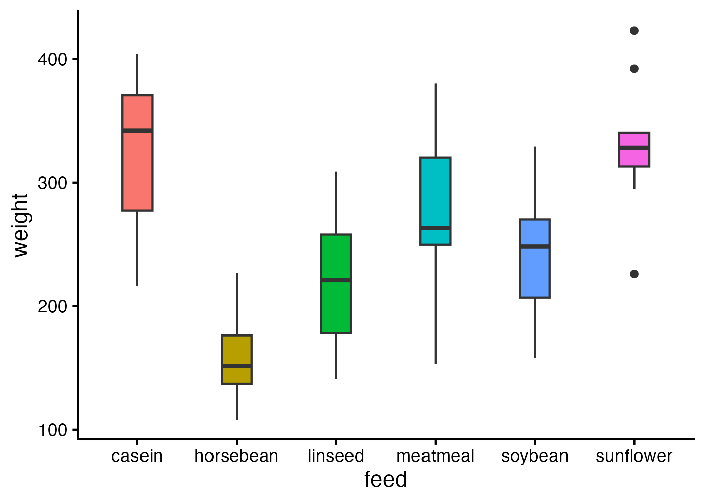 例として、Rに標準で含まれている chickwts(ひよこの体重データ)をみてみましょう。これは6種類の異なる餌をひよこに与えて育てた後の体重のデータであり、与える餌によって体重が異なるかどうかを調べるためのものです。